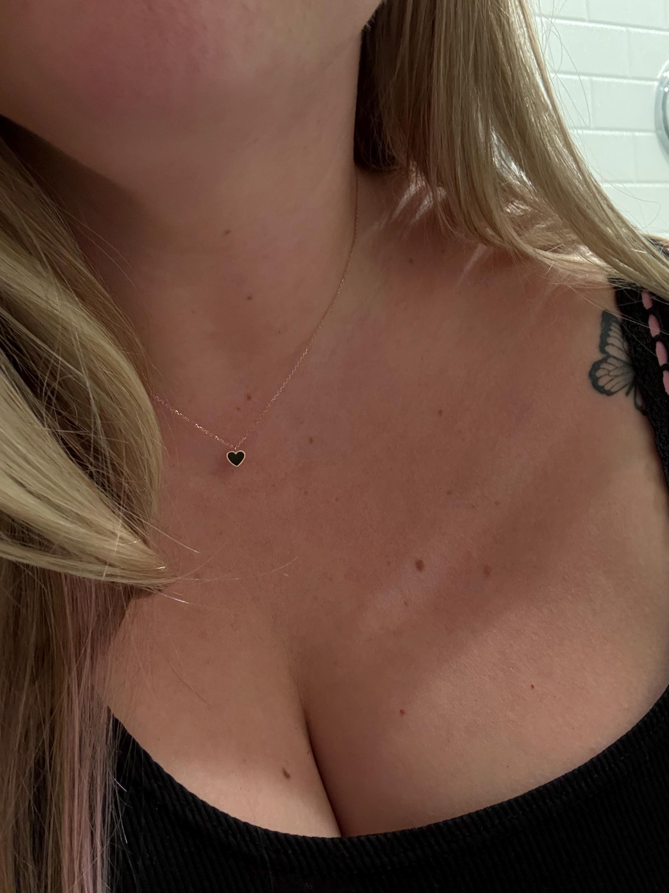 Handmade mini black enamel heart in 14k solid yellow gold . the chain that I use is a diamond cut cable link with a sturdy lobster lock. this necklace is available in black, pink and baby blue enamel. the heart is 14k solid gold and is available in 14k white gold, rose gold and yellow gold.