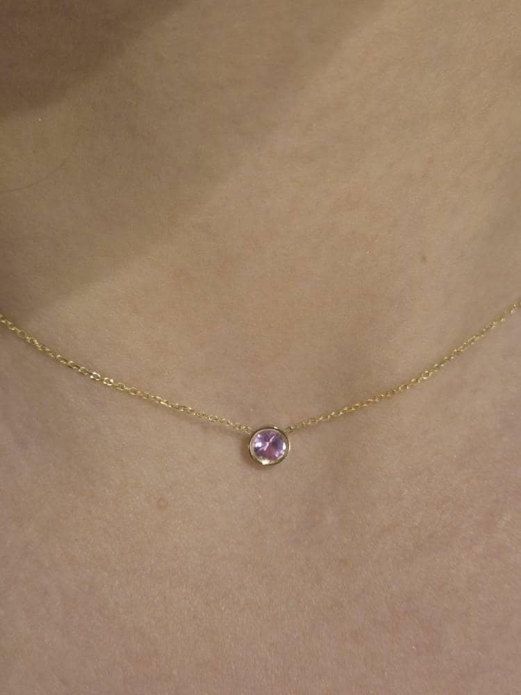 It’s a nicely made necklace. The pink sapphire is very sparkly and a lovely shade of pink. The necklace is dainty, as described. I wear it at night too and it’s comfortable. The sellers responded promptly when I asked questions and shipped within a few days of purchase.