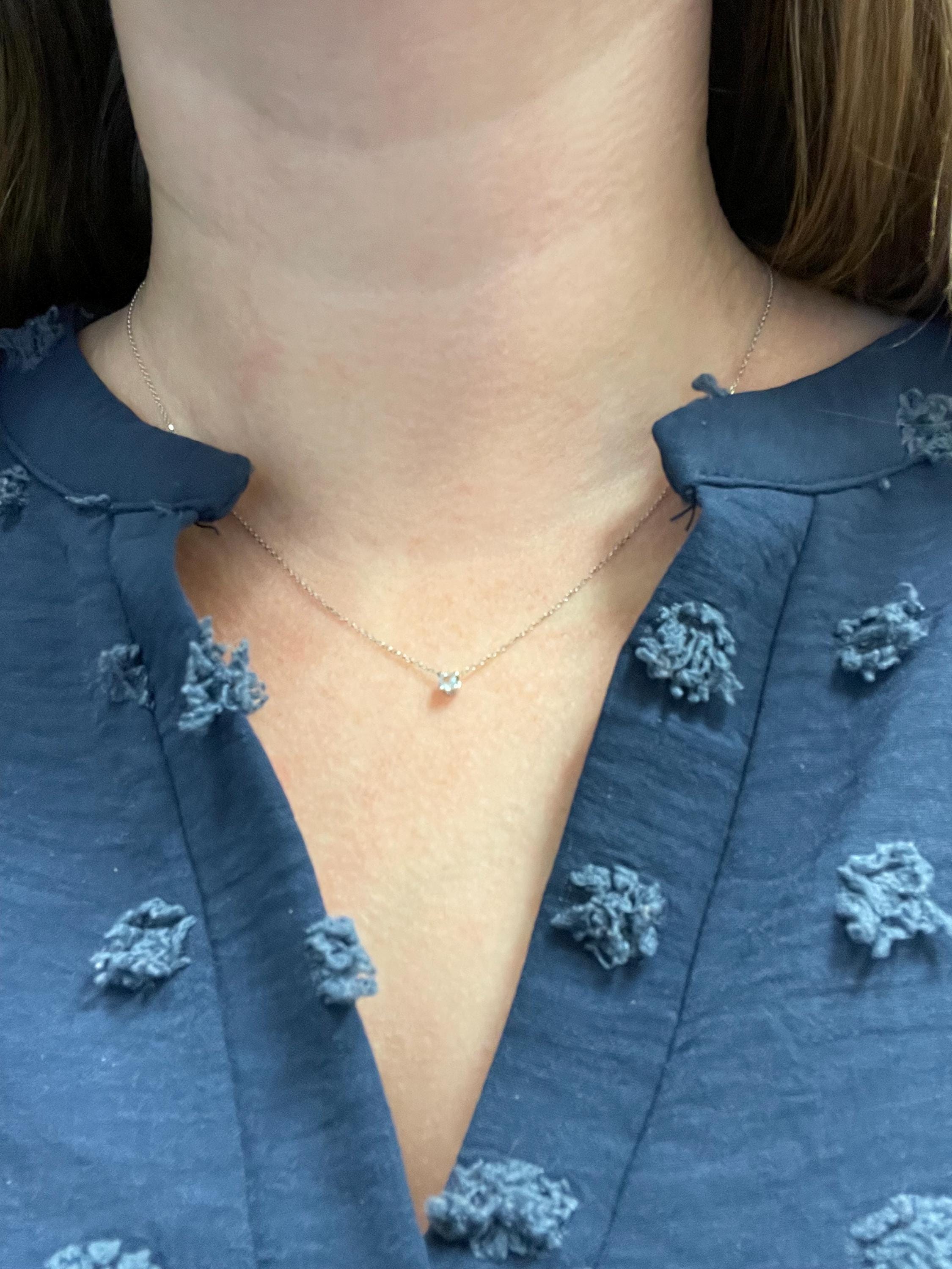 SIMPLE AND DELICATE. THE NATURAL AQUAMARINE IS 3 MM WIDE, ROUND FACETED CUT LIGHT AQUA COLOR . THE SETTING IS 4 PRONGS 14 K WHITE GOLD. IT BRINGS OUT THE AWESOME SPARKLY COLOR OF THE CENTER STONE . THE CHAIN IS ALSO 14 K WHITE GOLD SOLID CABLE LINK CHAIN AND ITS ATTACHED TO THE 4 PRONG SETTING FOR A PERFECT LAYOUT.