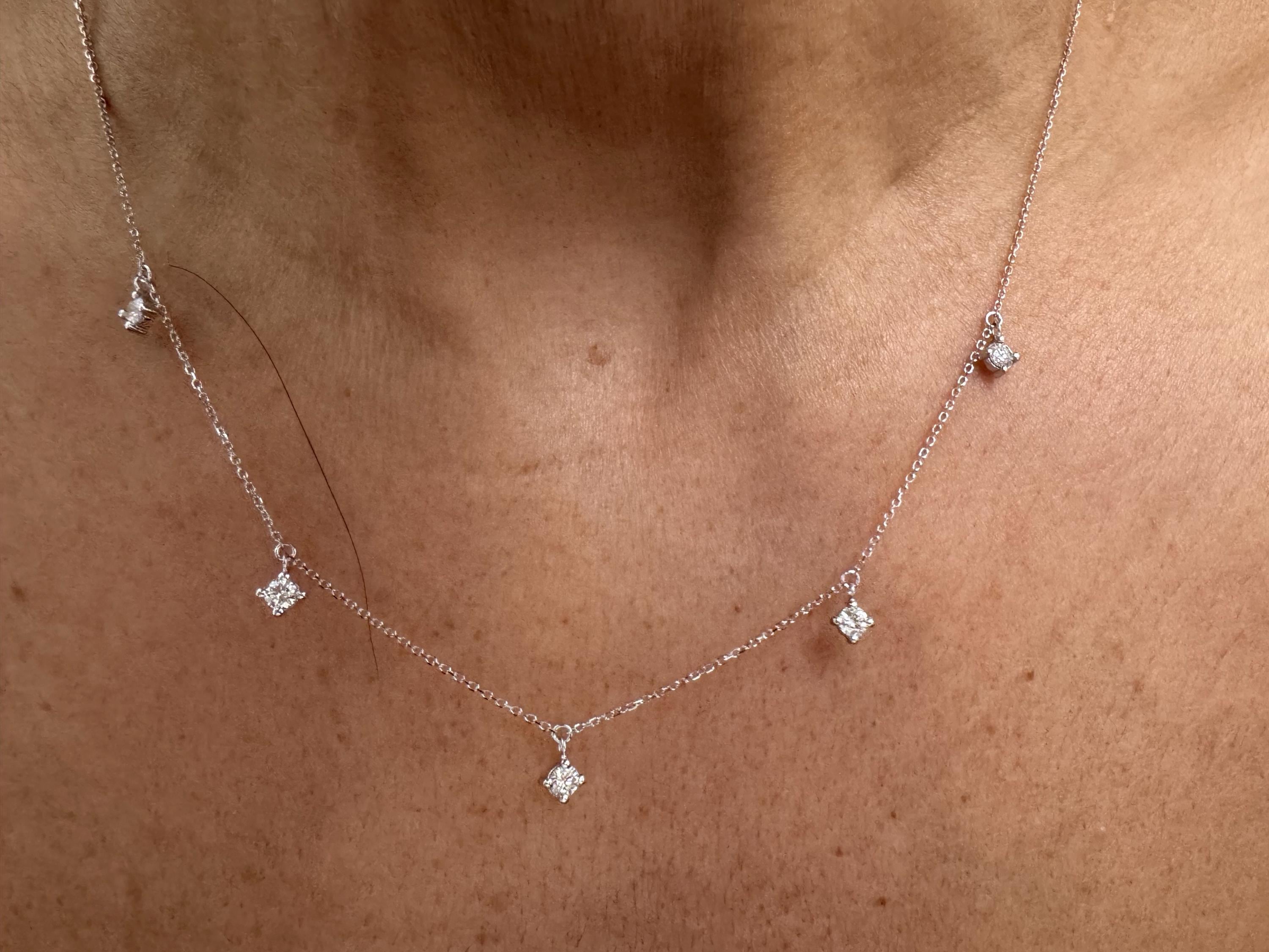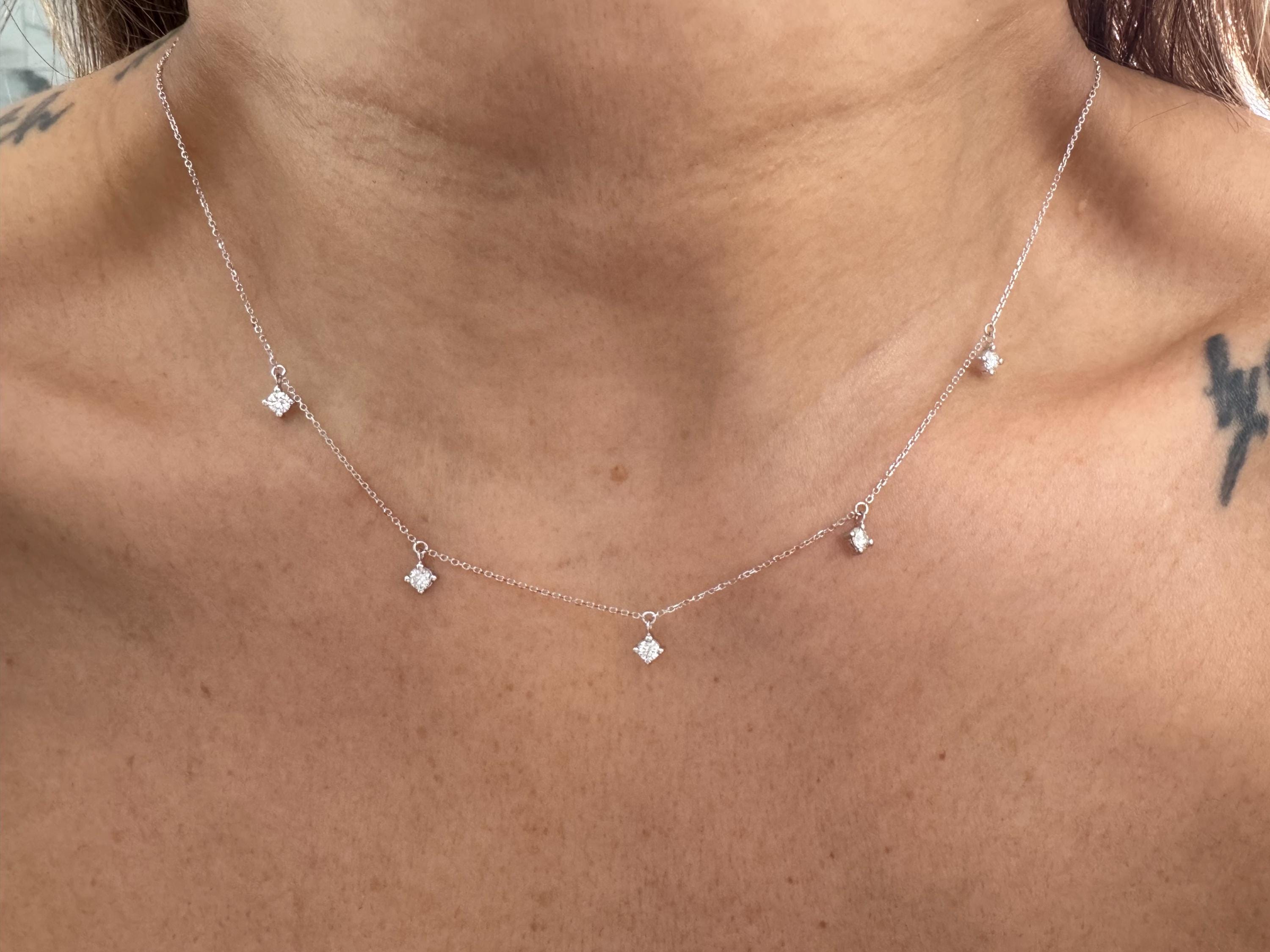 FEATURED DIAMOND NECKLACE IS STUNNING HAND MADE NATURAL 5 DIAMOND DANGLING PRONG SET STATION NECKLACE 14K SOLID YELLOW GOLD 0.50CTS IN TOTAL CARAT WEIGHT. EACH DIAMOND IS 0.10 CTS AND SET IN A 14K SOLID GOLD PRONG SETTING. THERE IS A TOTAL OF 5 DANGLING DIAMOND PRONGS ATTACHED TO A STURDY BUT DAINTY DIAMOND CUT CABLE LINK CHAIN WITH A LOBSTER LOCK. BEAUTIFUL , ELEGANT AND DAINTY. I MAKE THIS IN 14K WHITE GOLD, YELLOW GOLD AND ROSE GOLD AND IN VARIOUS LENGHTS. IF YOU HAVE ANY SPECIAL REQUESTS, PLEASE FEEL FREE TO REACH OUT. I WILL DO MY BEST TO ACCOMADATE.