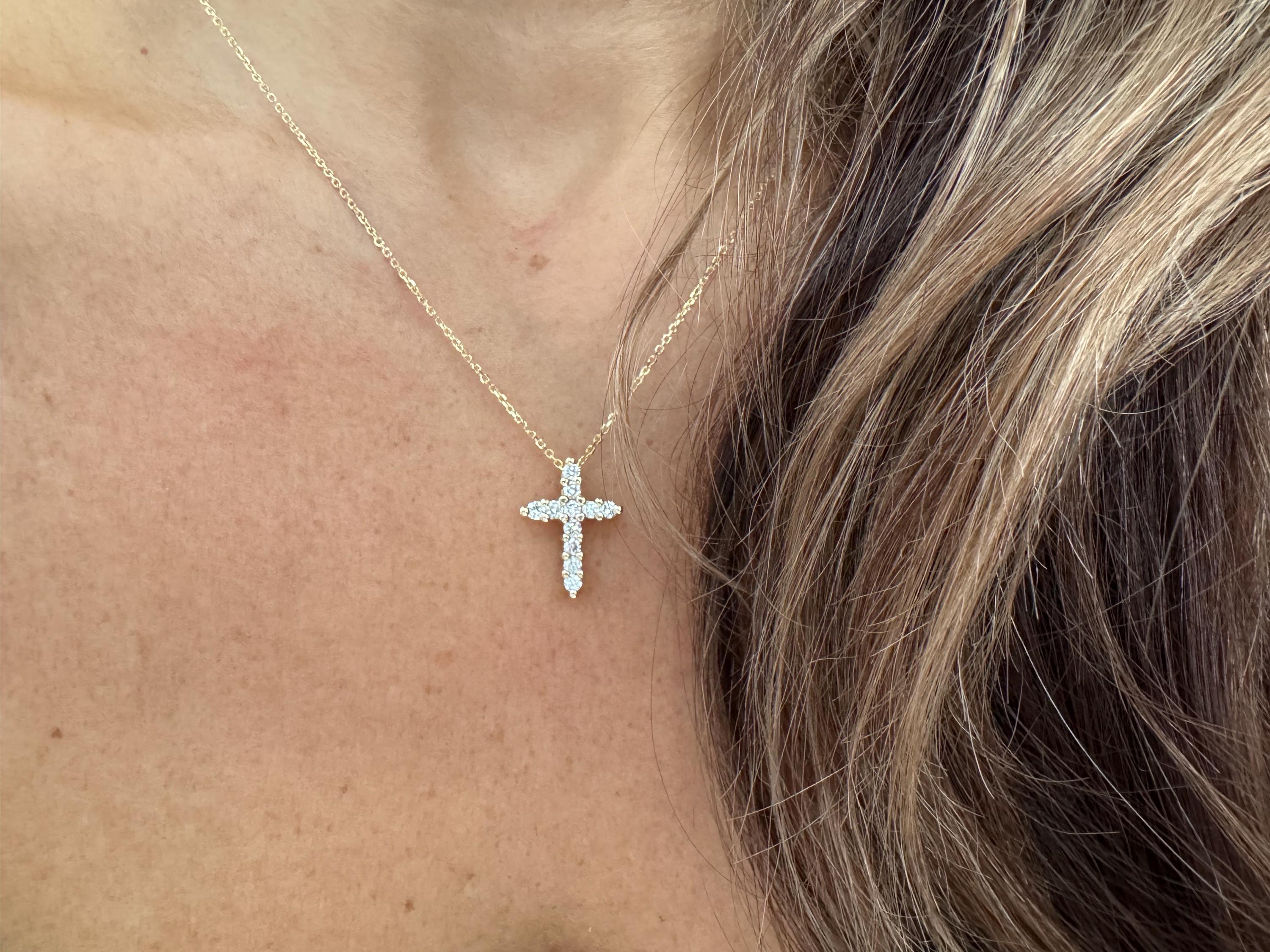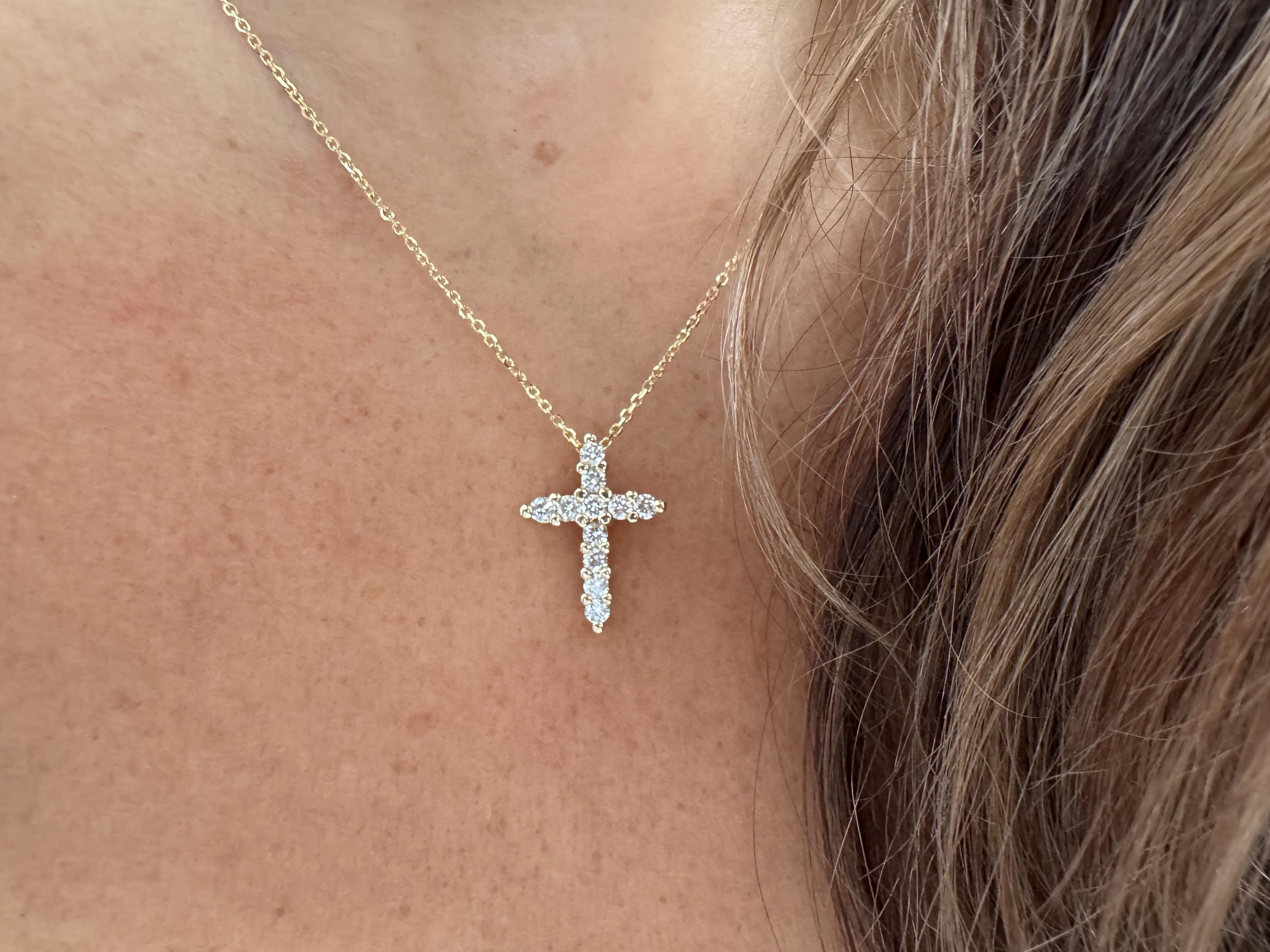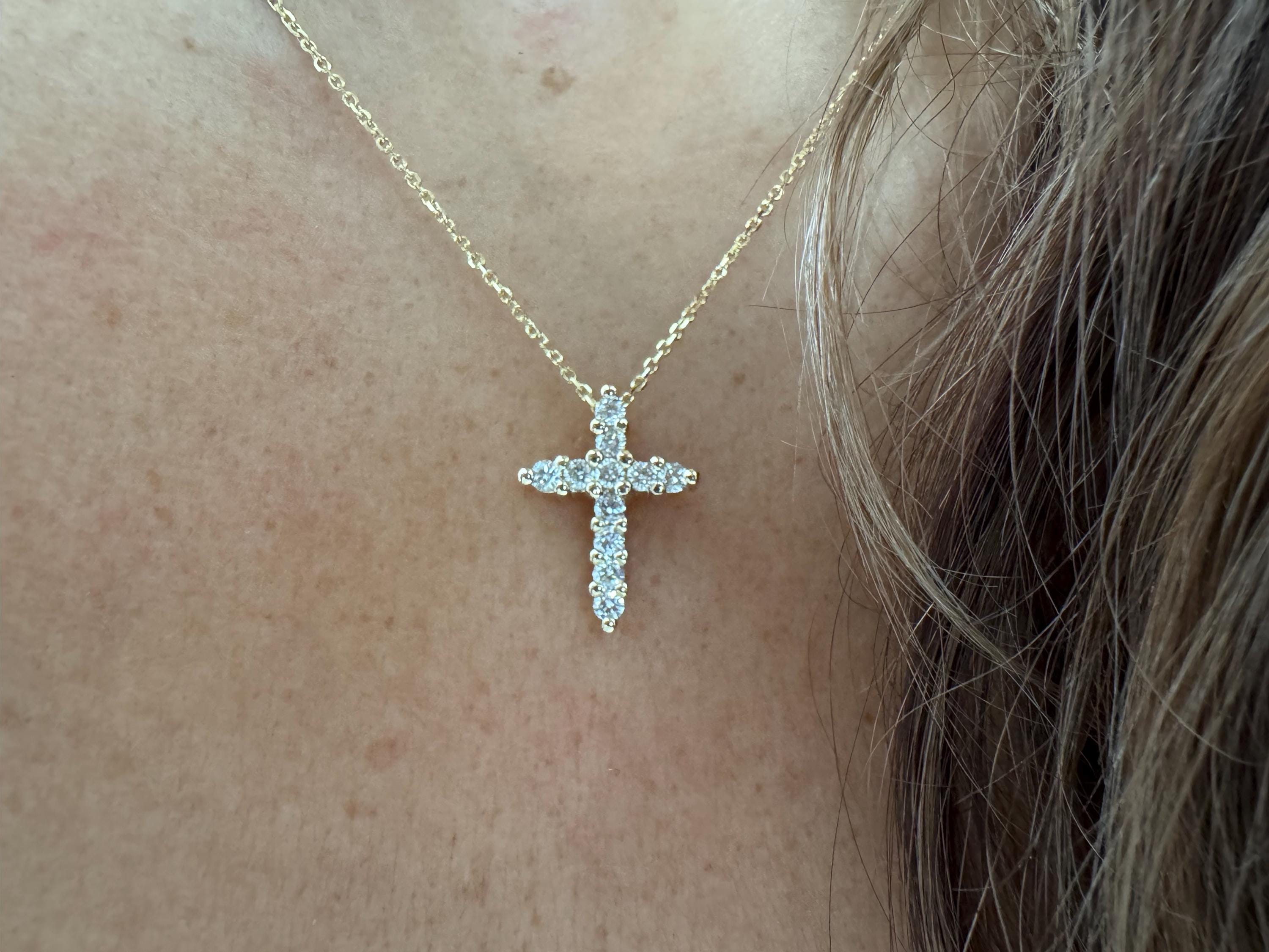 Handmade beautiful minimalist diamond cross with 11 full cut round brilliant natural diamonds 0.55 ct tcw SI1 CLARITY G color. I handset these diamonds myself. I make this cross in 14k solid white , yellow and rose gold and in various lengths. please specify the color gold and length when ordering.