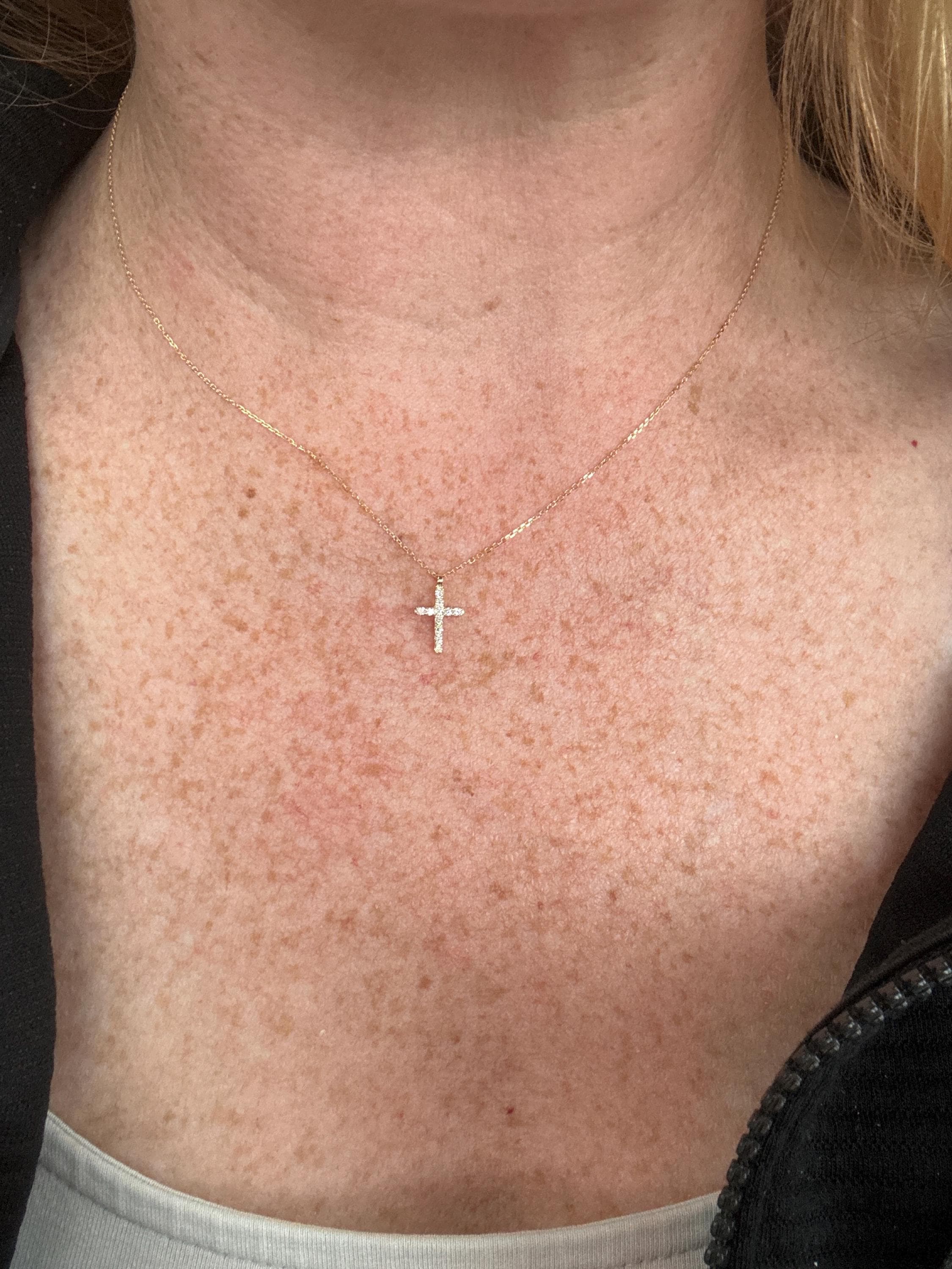Beautiful cross necklace - very sparkly. Item was shipped fast. The seller allowed me to exchange a 16’ inch for 17’ inch necklace-the seller was very accommodating. The exchange was done with ease and with no hiccups. Based on my positive experience, I would recommend this seller and do business with them again.