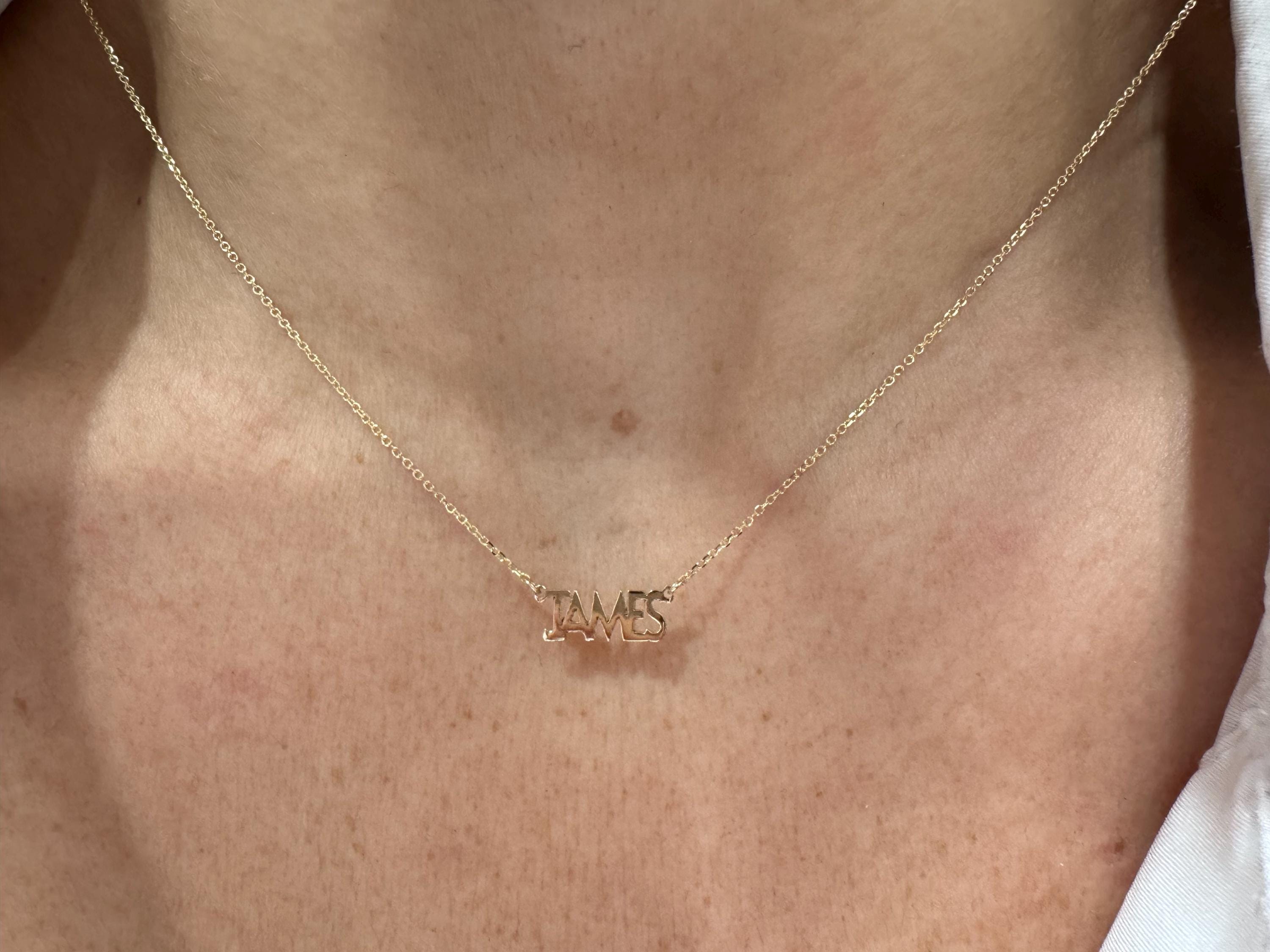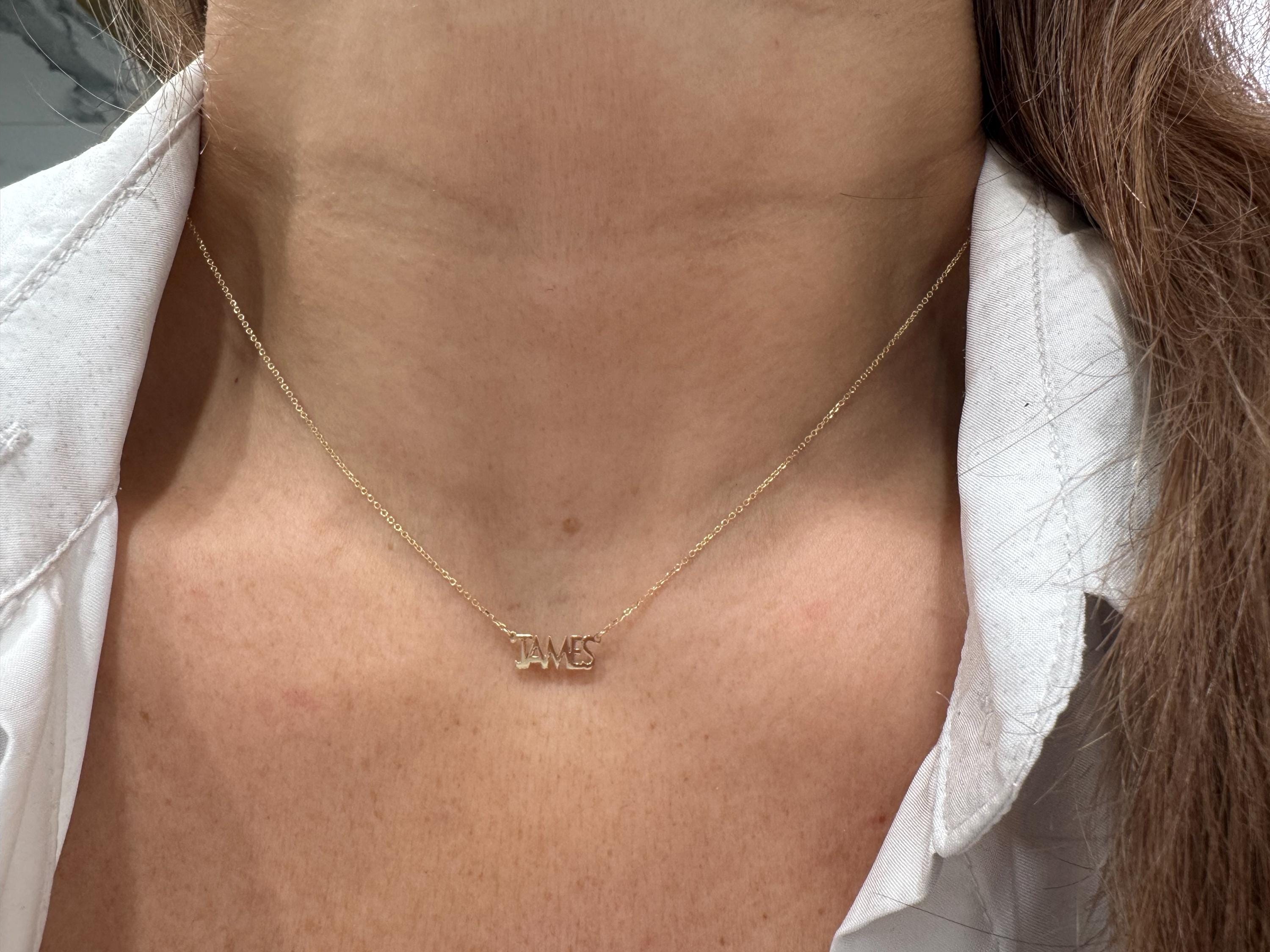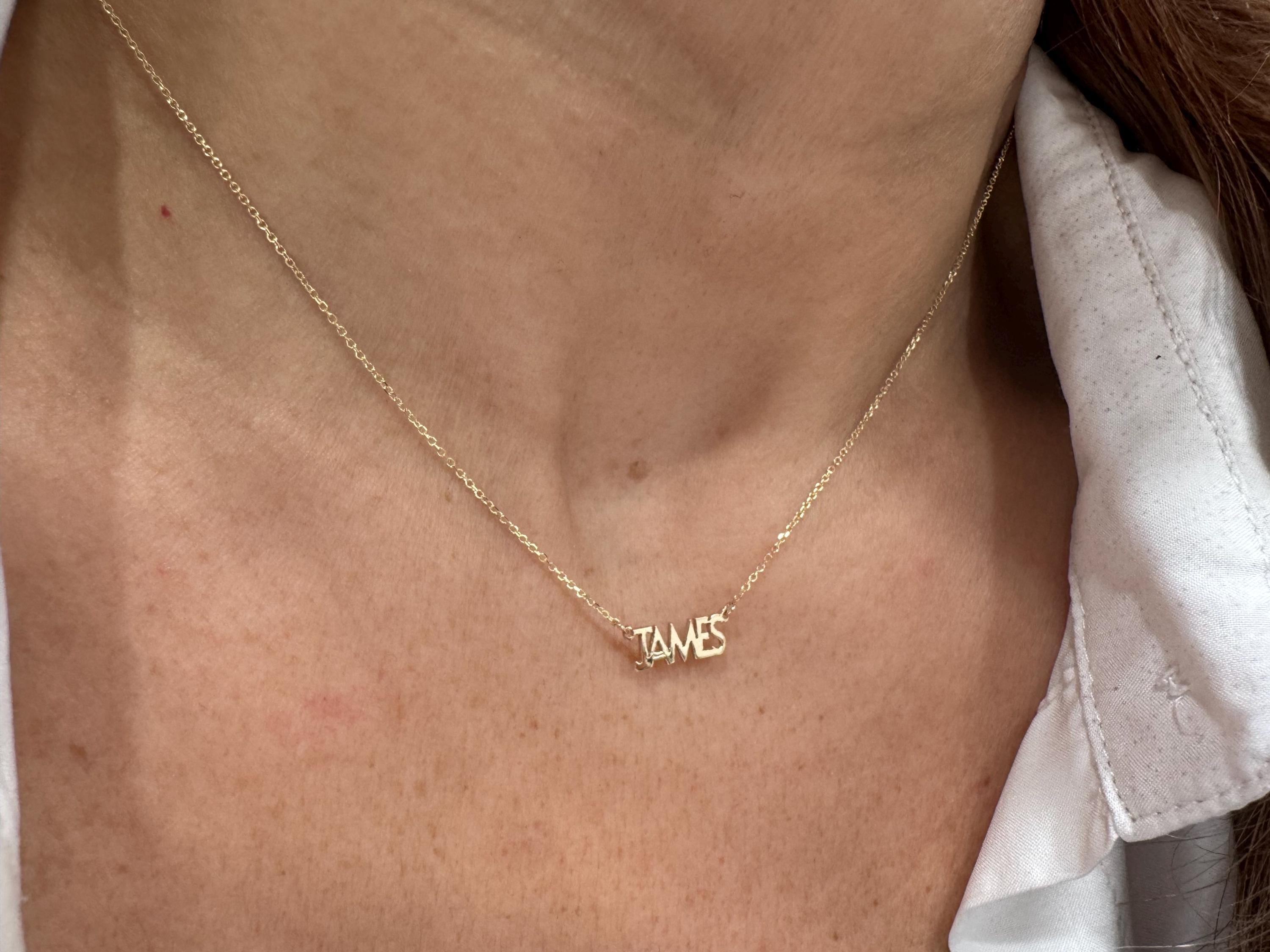 14K SOLID YELLOW GOLD NAME NECKLACE THAT IS CUSTOM HANDMADE WITH THE NAME YOU WANT ON IT. THIS NECKLACE IS ALSO AVAILABLE IN WHITE AND ROSE (PINK) GOLD. PLEASE MAKE SURE YOU SPECIFY THE COLOR GOLD THAT YOU WOULD LIKE AND THE LENGTH YOU WOULD LIKE IT TO BE. BEAUTIFUL MINI GOLD NAME PLATE. CAN BE WORN ALONE OR AS LAYERING NECKLACE.