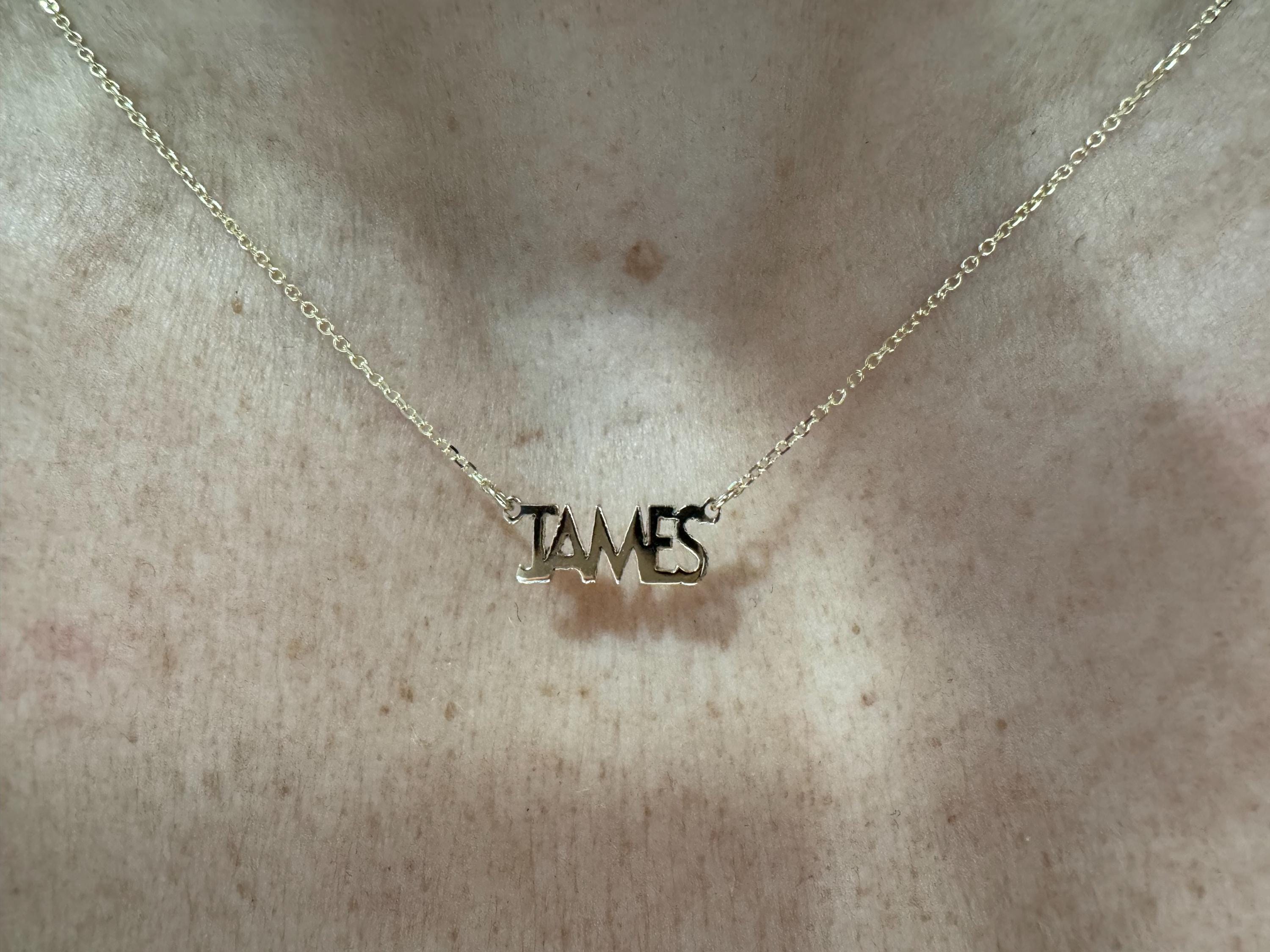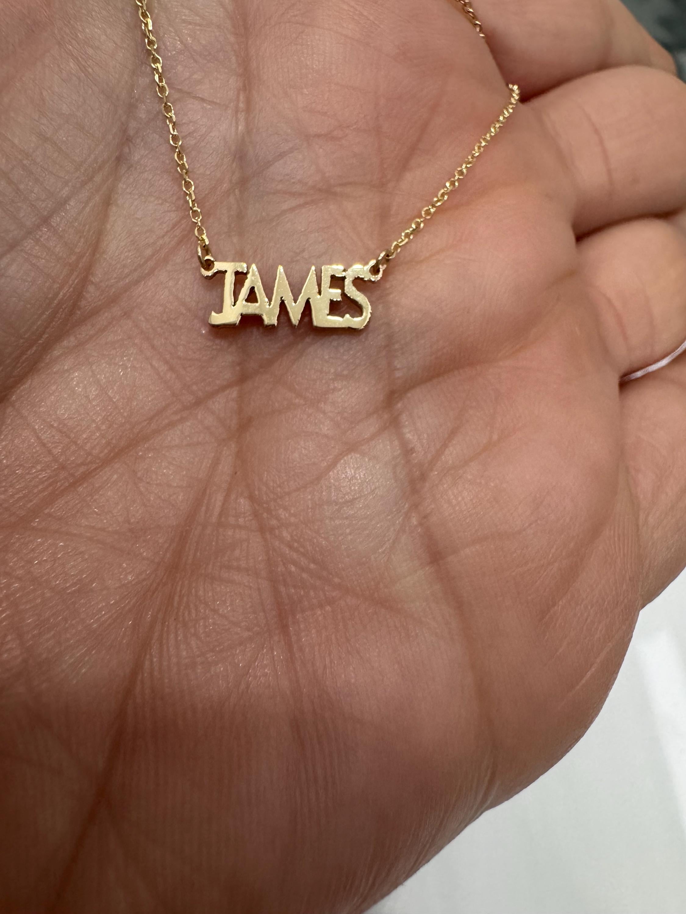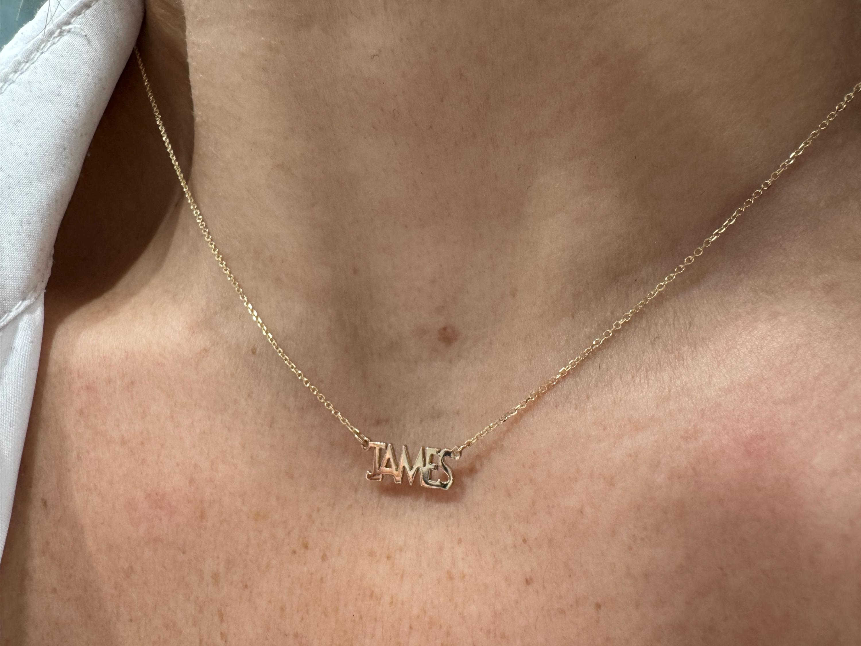 14K SOLID YELLOW GOLD NAME NECKLACE THAT IS CUSTOM HANDMADE WITH THE NAME YOU WANT ON IT. THIS NECKLACE IS ALSO AVAILABLE IN WHITE AND ROSE (PINK) GOLD. PLEASE MAKE SURE YOU SPECIFY THE COLOR GOLD THAT YOU WOULD LIKE AND THE LENGTH YOU WOULD LIKE IT TO BE. BEAUTIFUL MINI GOLD NAME PLATE. CAN BE WORN ALONE OR AS LAYERING NECKLACE.