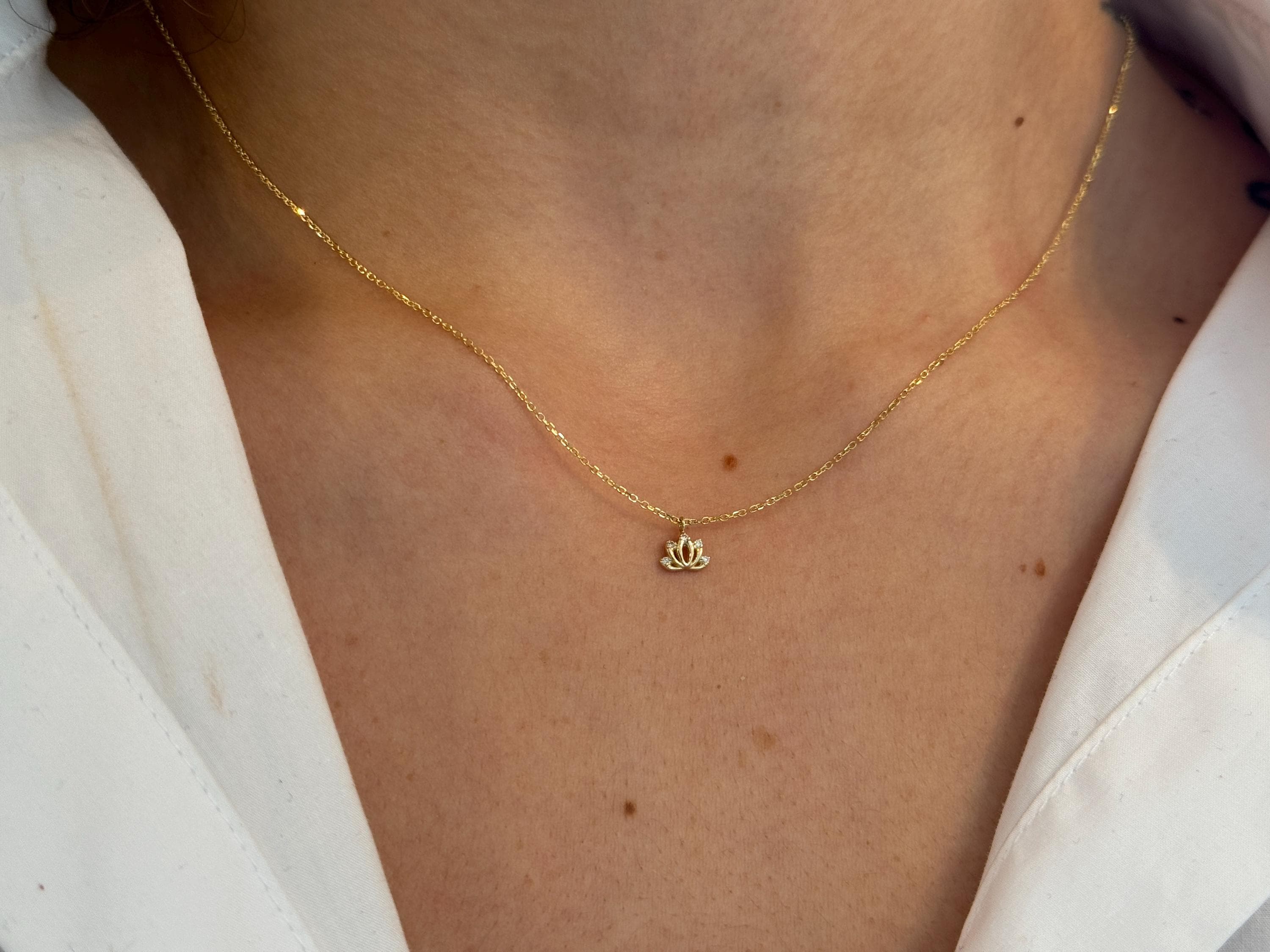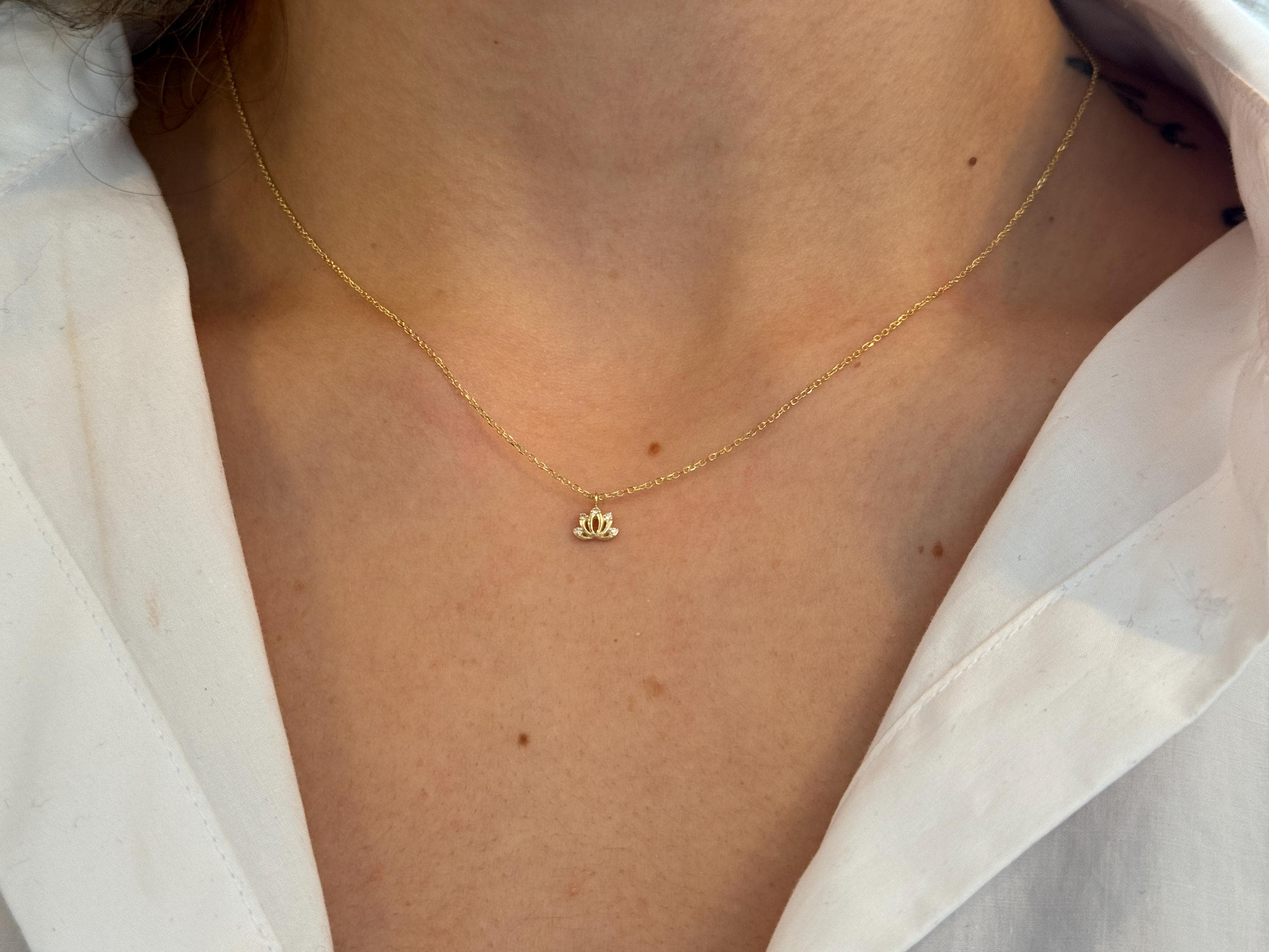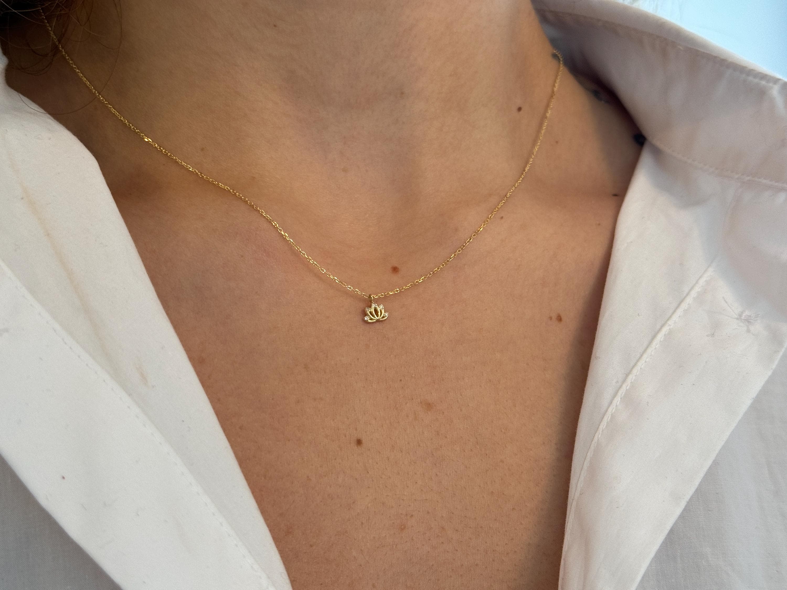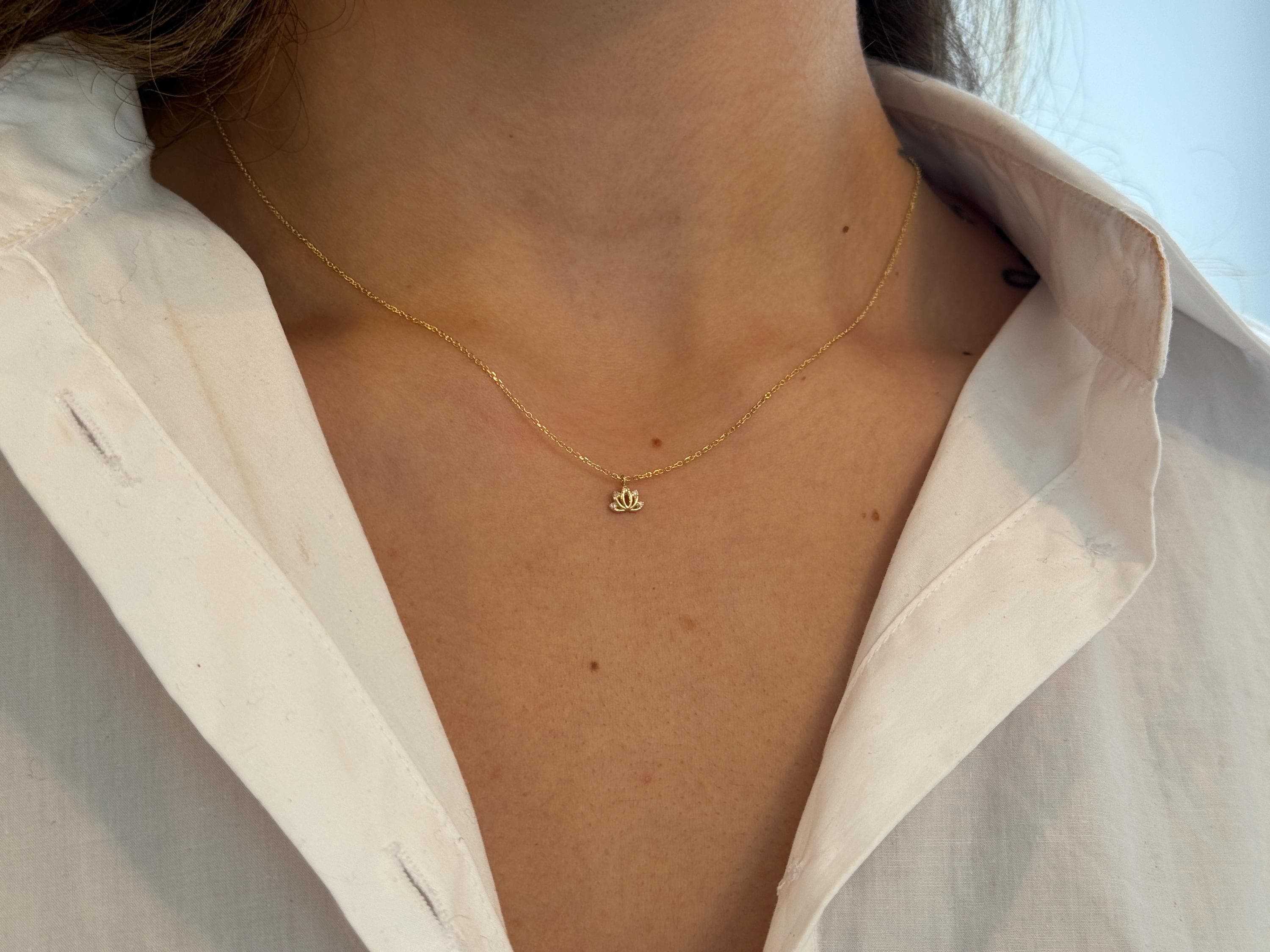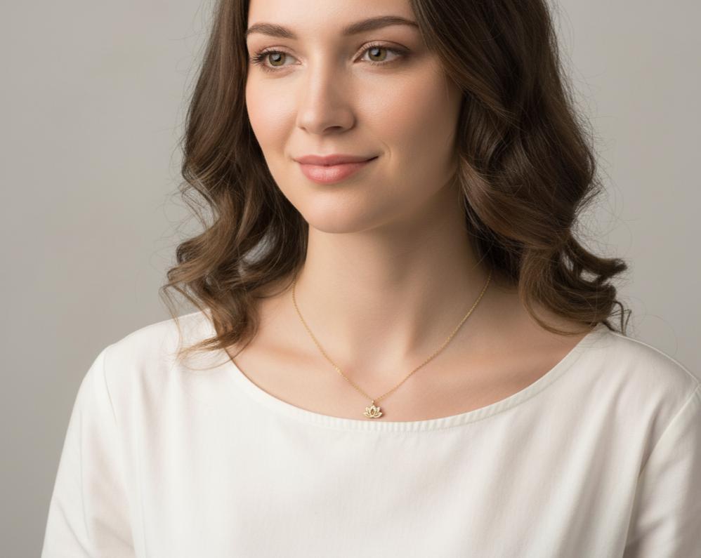 14K solid gold lotus flower necklace. This stunning piece features a delicate, intricately detailed lotus charm, centered with a brilliant, ethically sourced diamond. A symbol of purity, enlightenment, and spiritual growth, this necklace is designed to be more than just an accessory—it’s a personal talisman for a mindful and beautiful life.