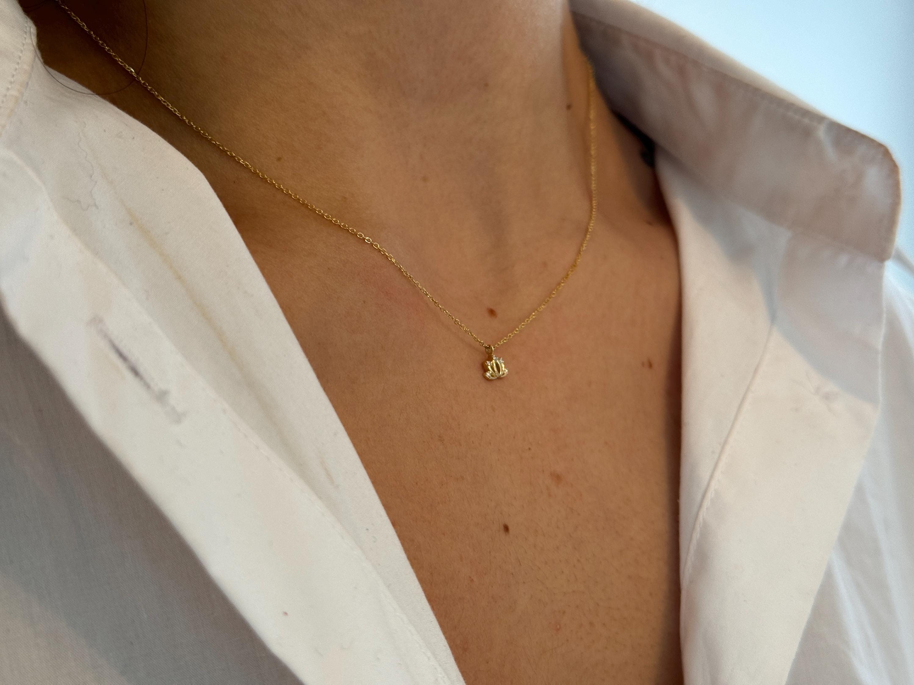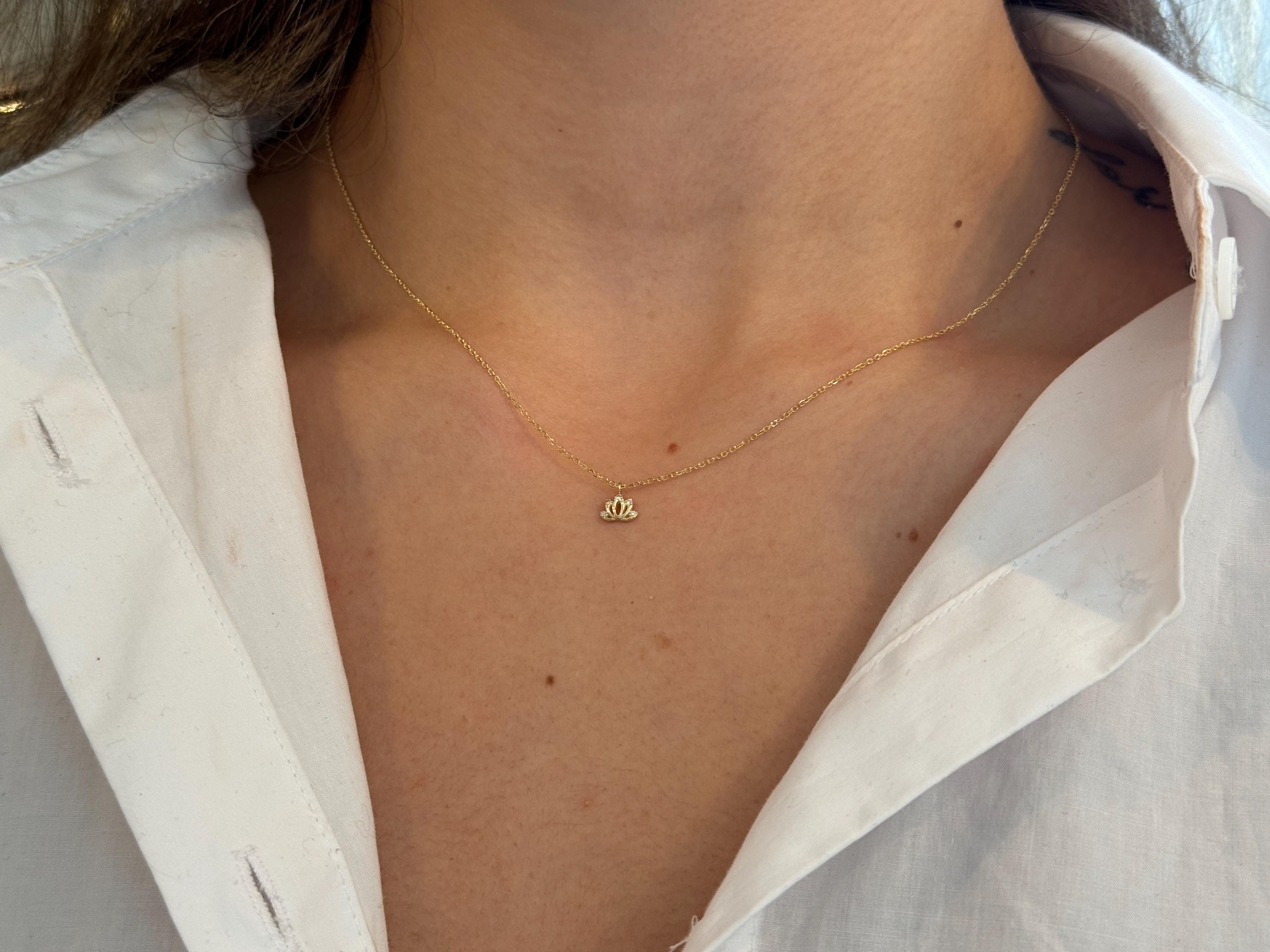 14K Gold Lotus Necklace with Diamond | Dainty Lotus Flower Pendant | Solid Gold Yoga Jewelry | Gift for Her