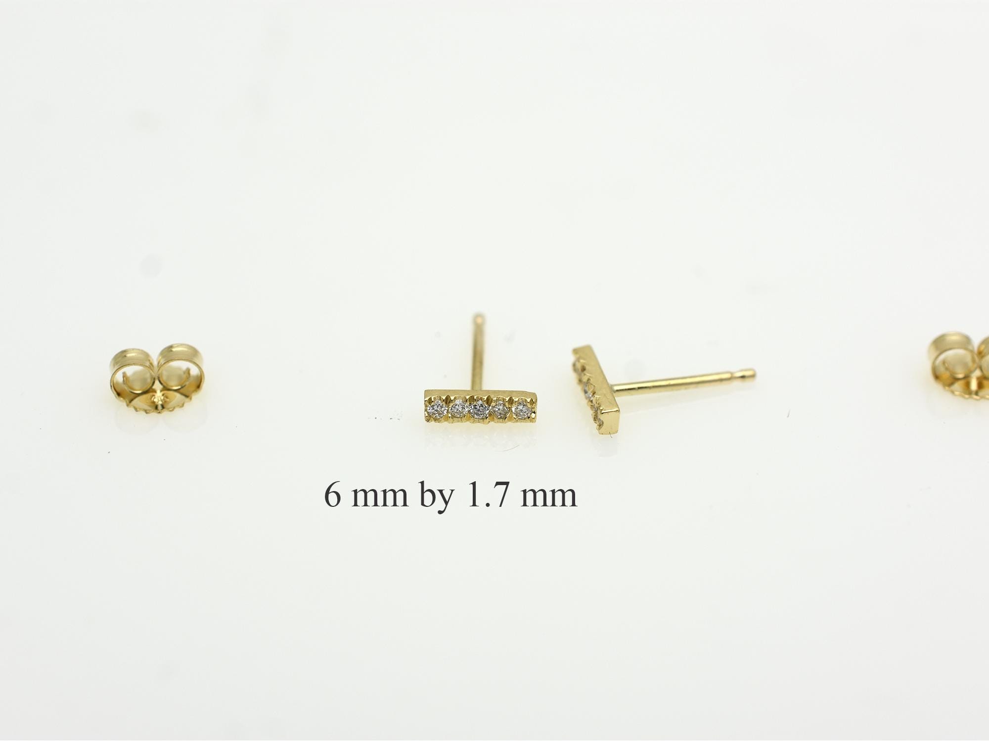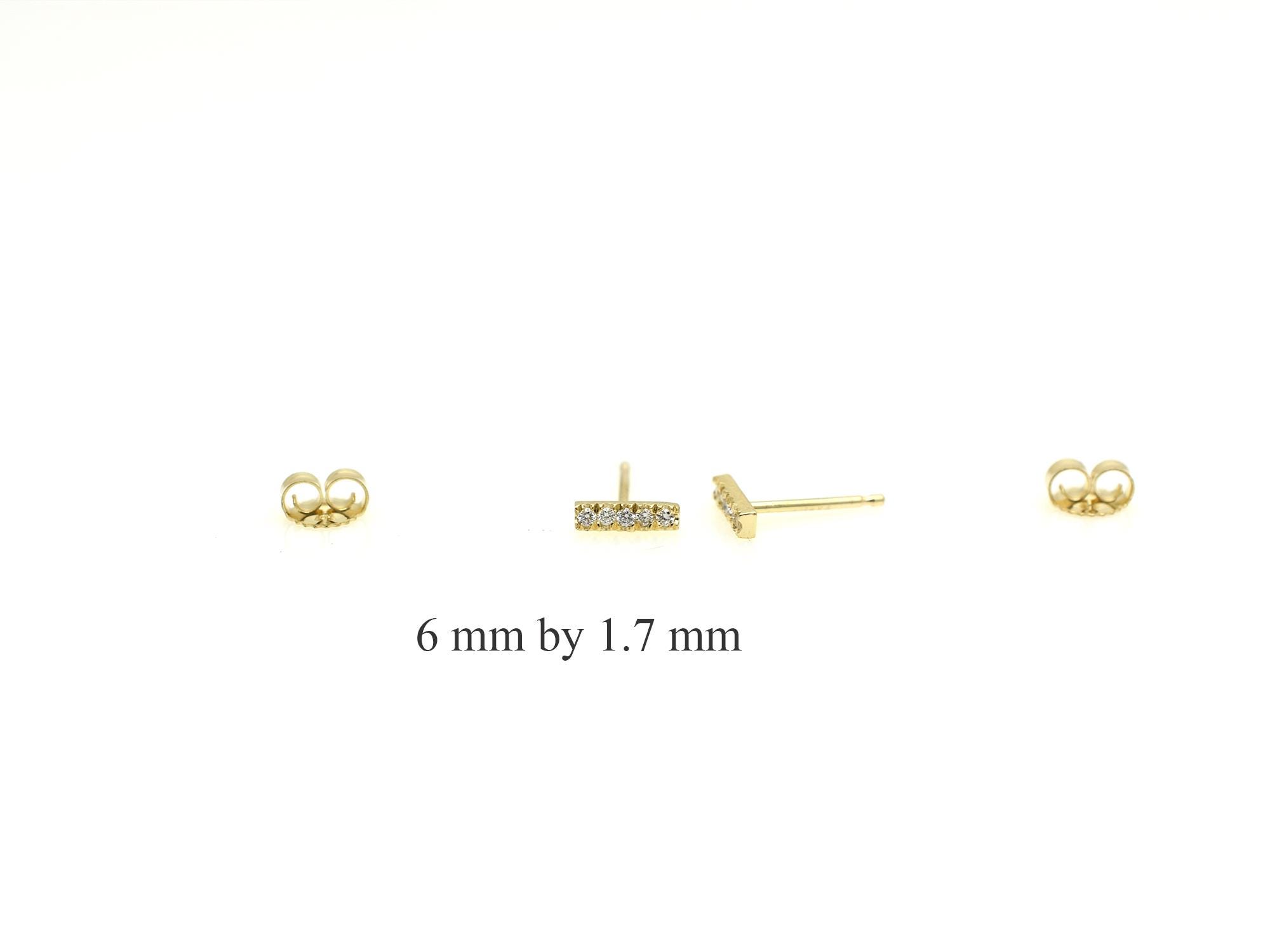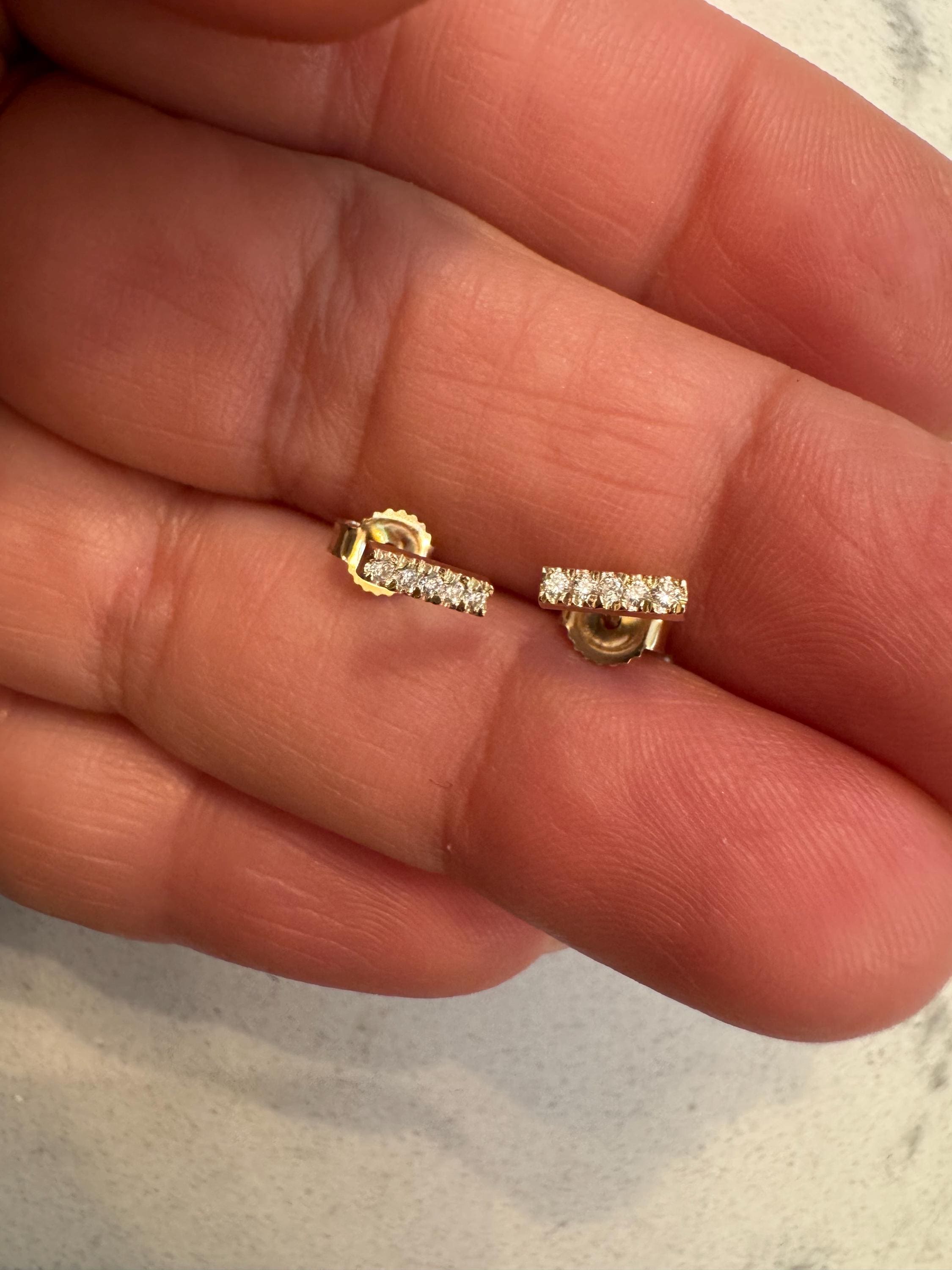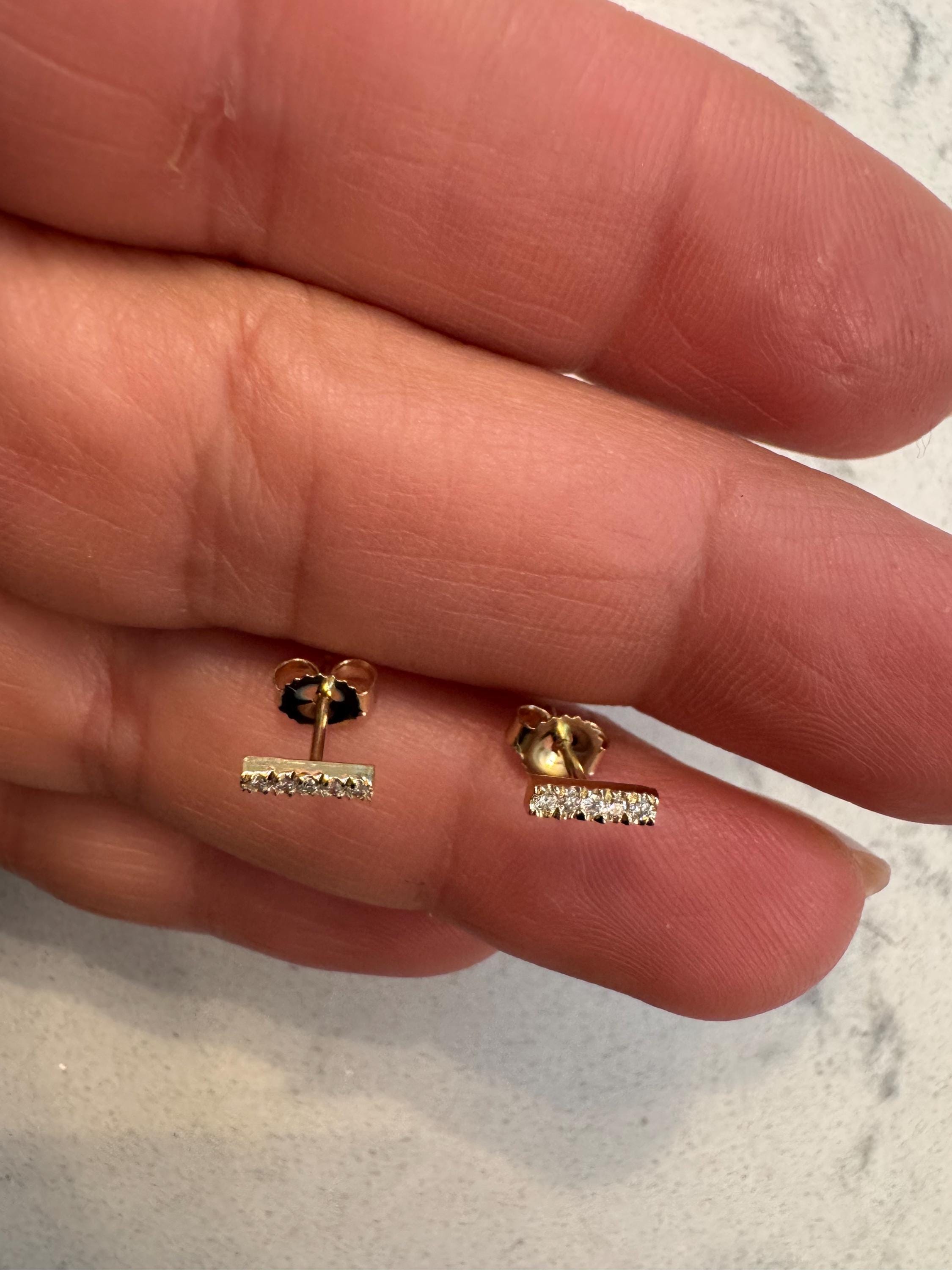 Elevate your everyday style with these exquisite Dainty Diamond Bar Stud Earrings, crafted from genuine 14K solid gold. Each earring features a delicate bar adorned with sparkling, ethically sourced natural diamonds, set to catch the light with every movement.