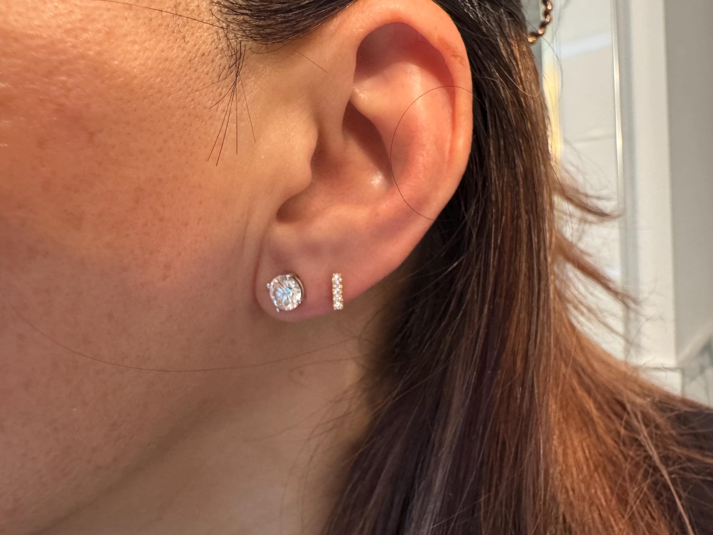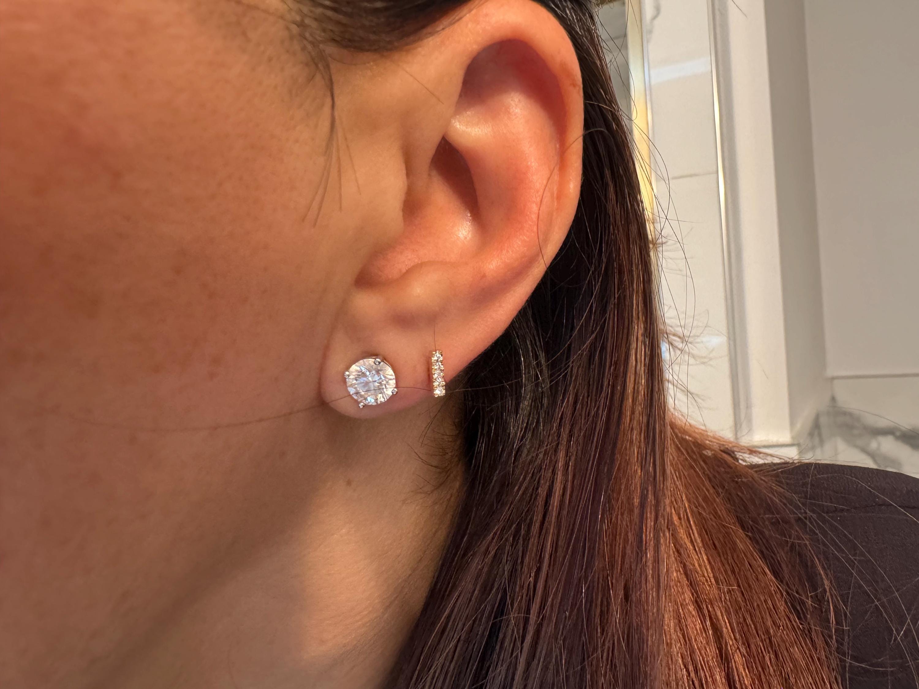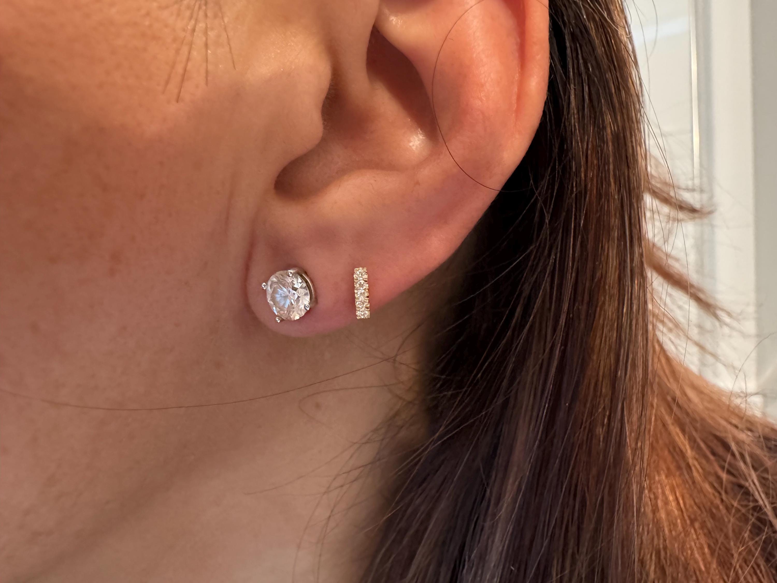 These minimalist diamond earrings are the perfect blend of modern elegance and timeless sophistication. Their subtle design makes them versatile enough for daily wear, yet they add a touch of luxury to any outfit, from casual chic to evening glam. They are so comfortable, you'll forget you're wearing them!