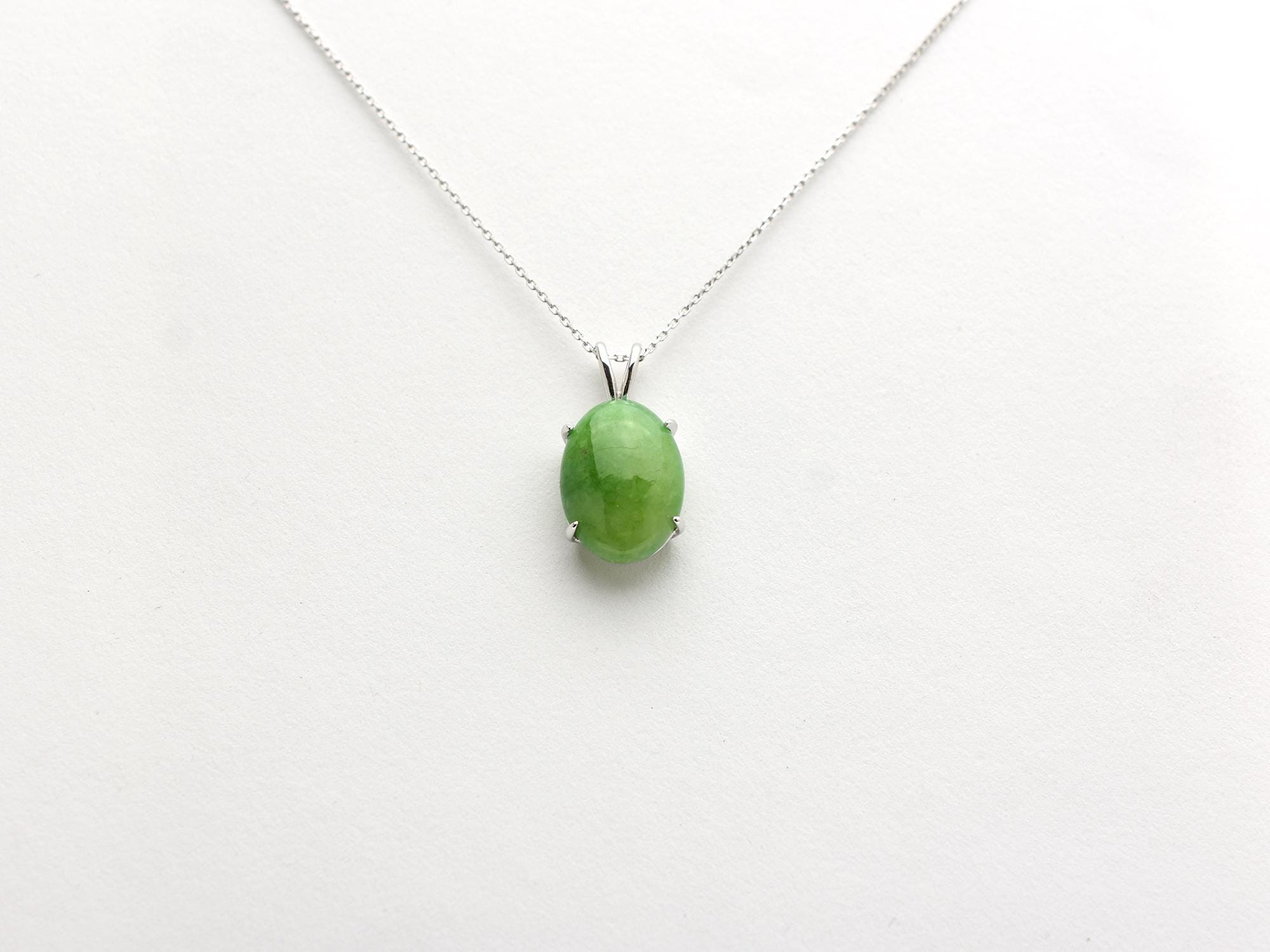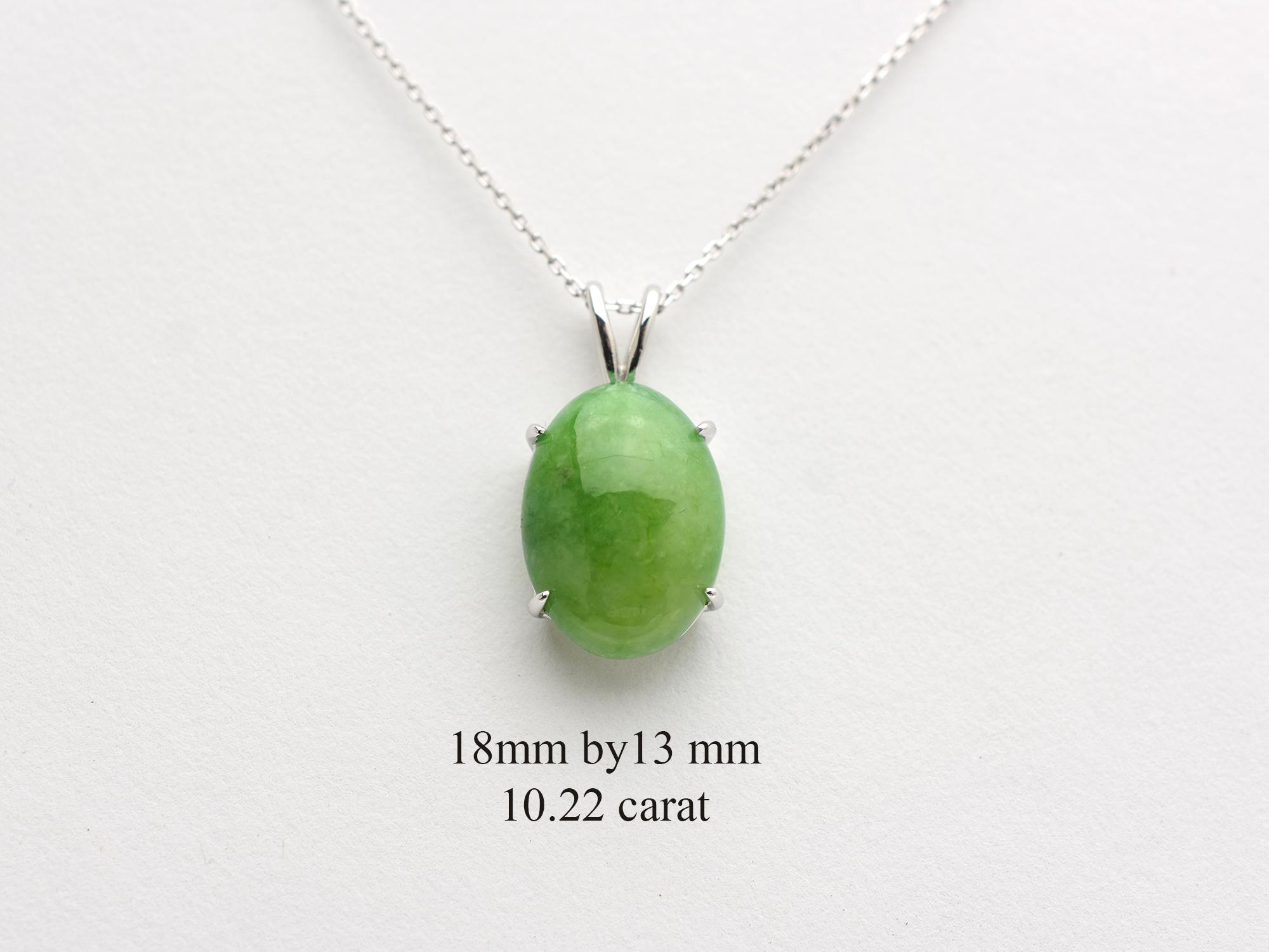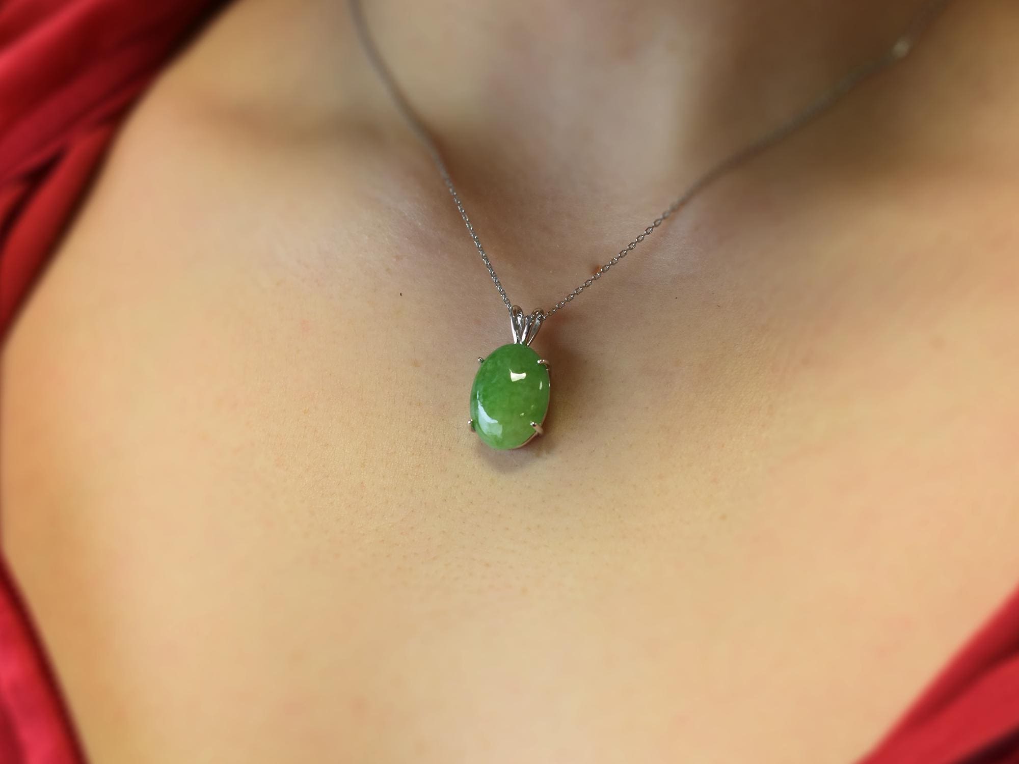 Featuring a substantial 10.22 carat genuine jade stone, this necklace showcases a vibrant, earthy green hue with a smooth, polished finish. The oval cabochon cut is perfectly cradled in a high-quality 925 Sterling Silver four-prong setting, ensuring both security and a minimalist aesthetic that highlights the stone's natural beauty.