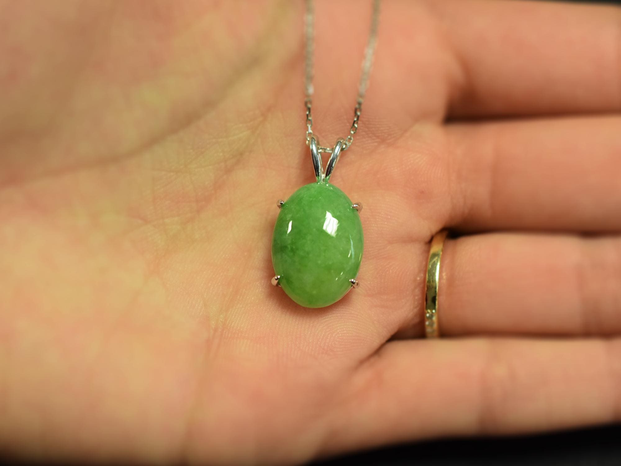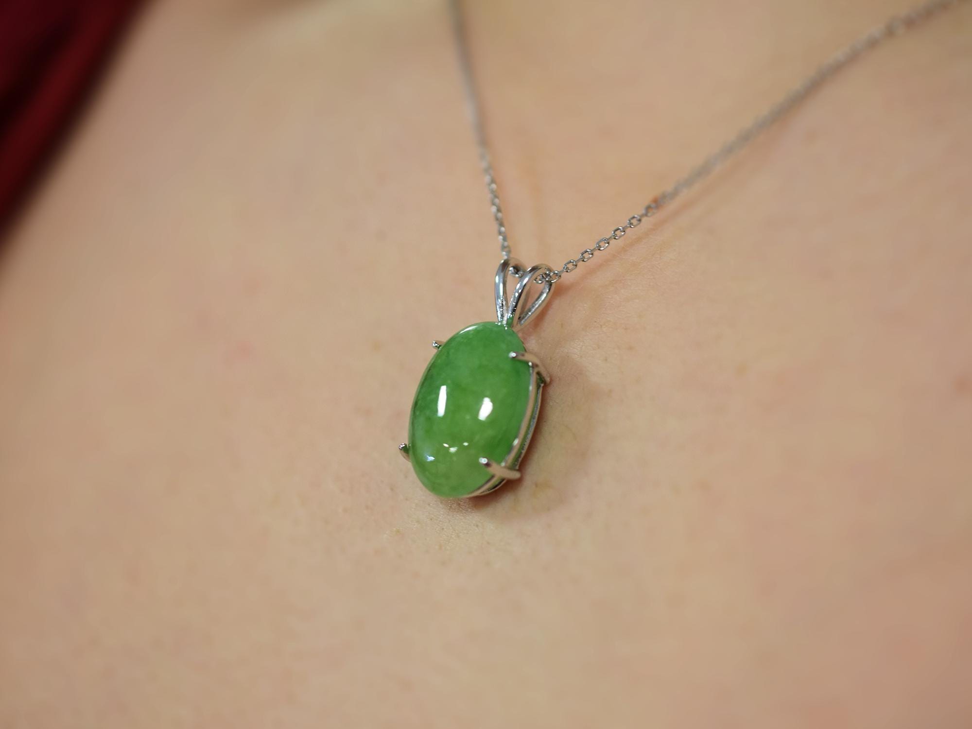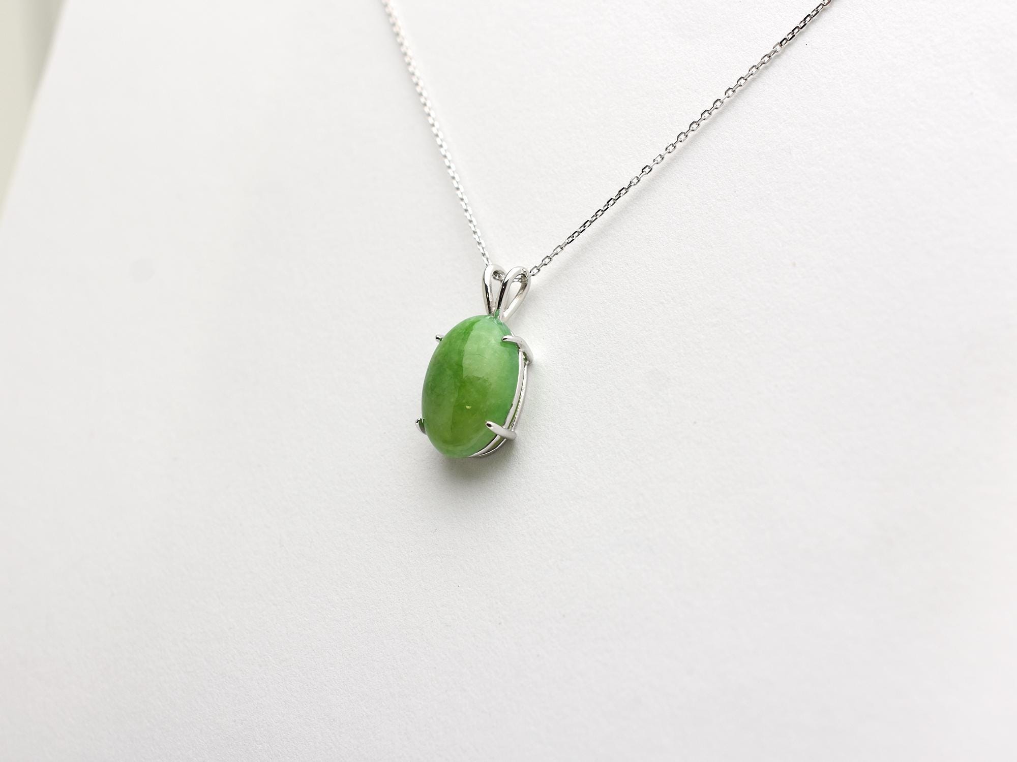 Featuring a substantial 10.22 carat genuine jade stone, this necklace showcases a vibrant, earthy green hue with a smooth, polished finish. The oval cabochon cut is perfectly cradled in a high-quality 925 Sterling Silver four-prong setting, ensuring both security and a minimalist aesthetic that highlights the stone's natural beauty.