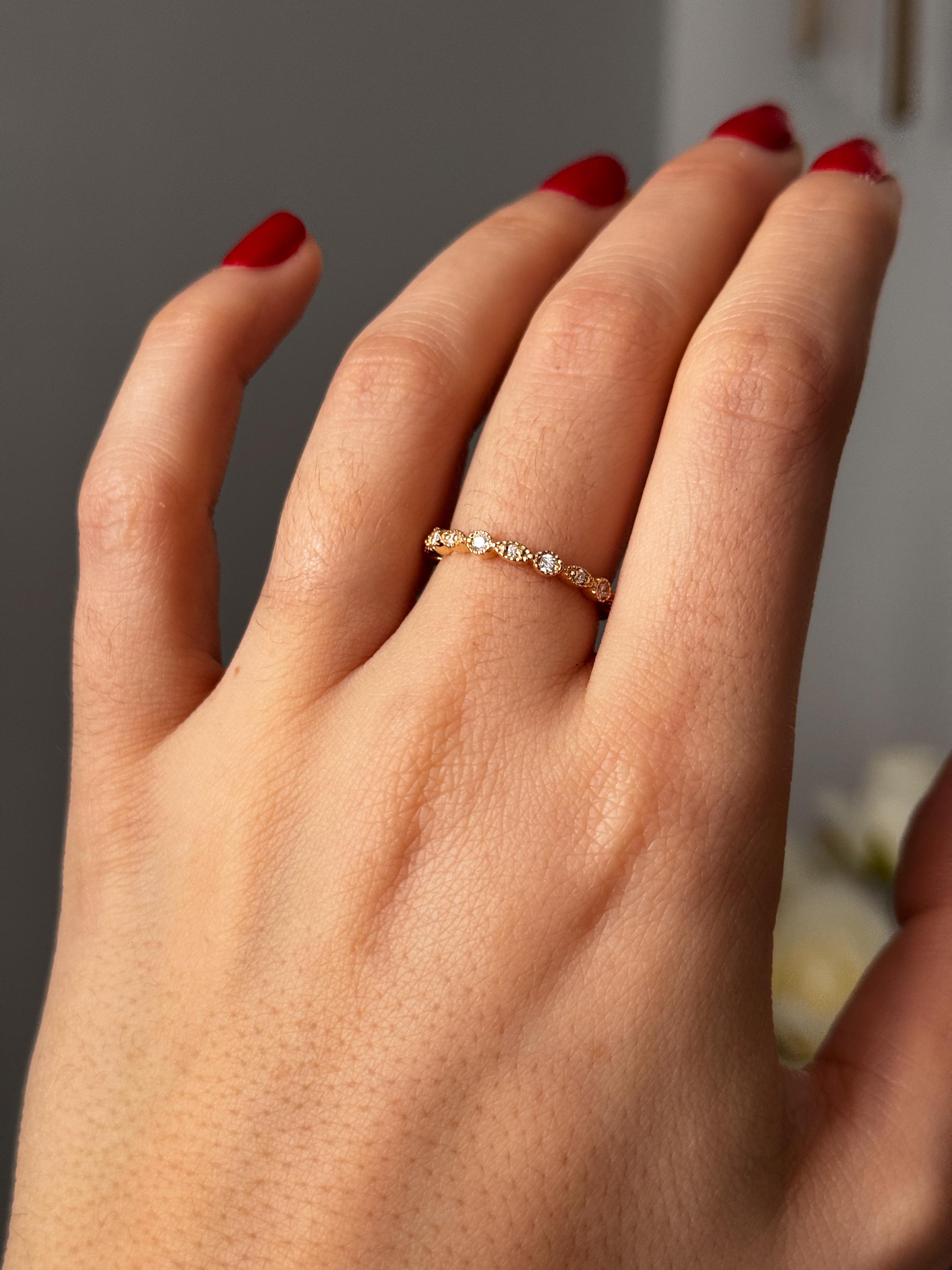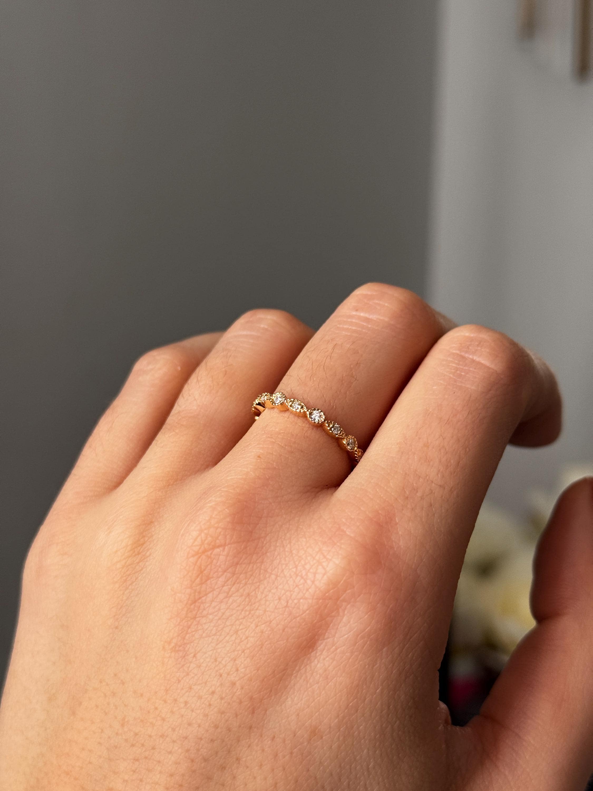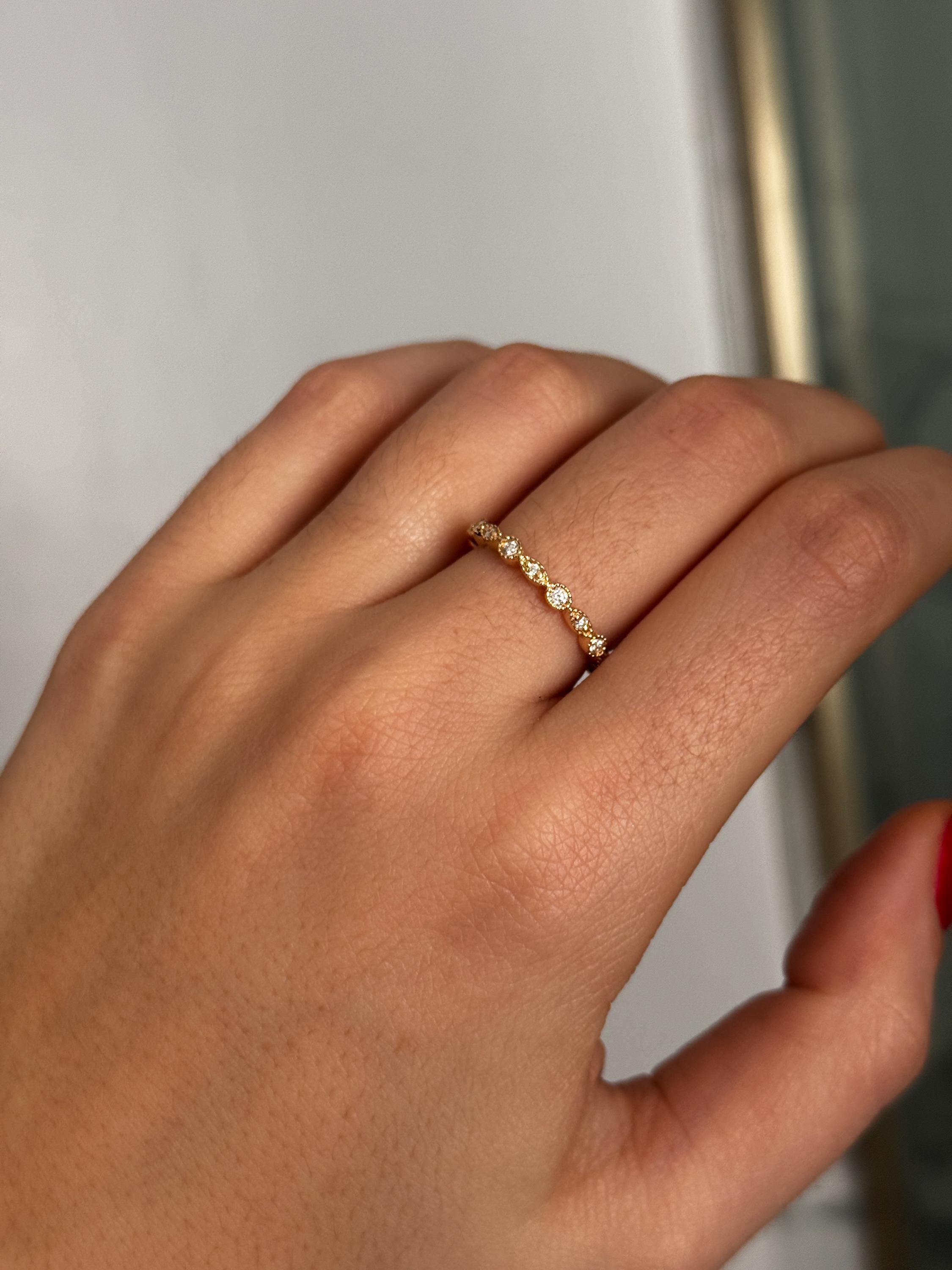 Elevate your stack with this exquisite 14k gold diamond wedding band. Designed with a timeless, vintage-inspired aesthetic, this band features a delicate alternating pattern of round and marquise-shaped mill grain settings, each housing a brilliant natural diamond.