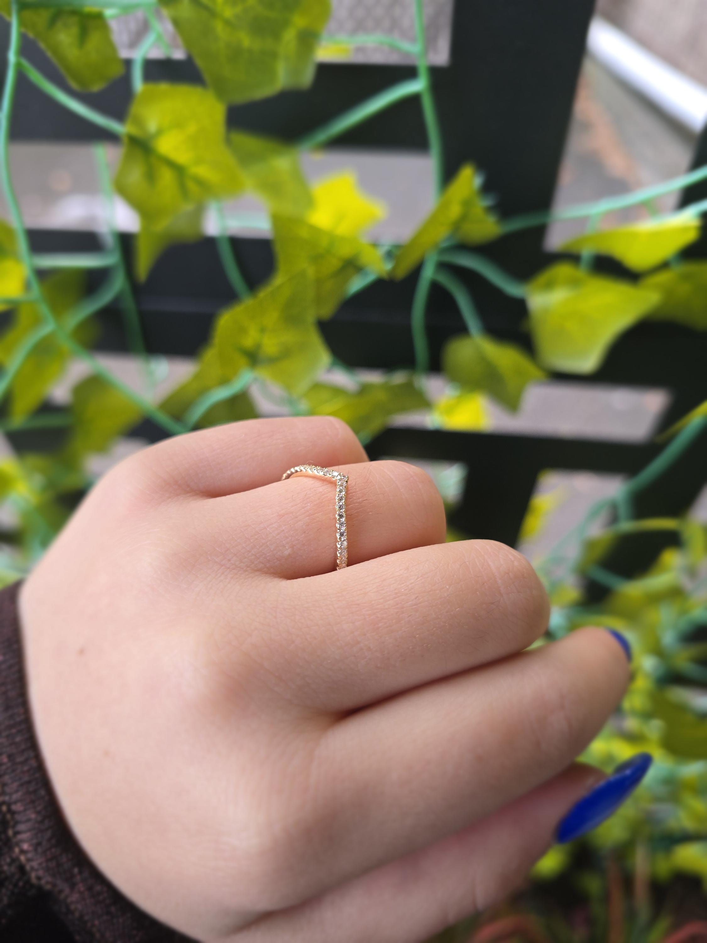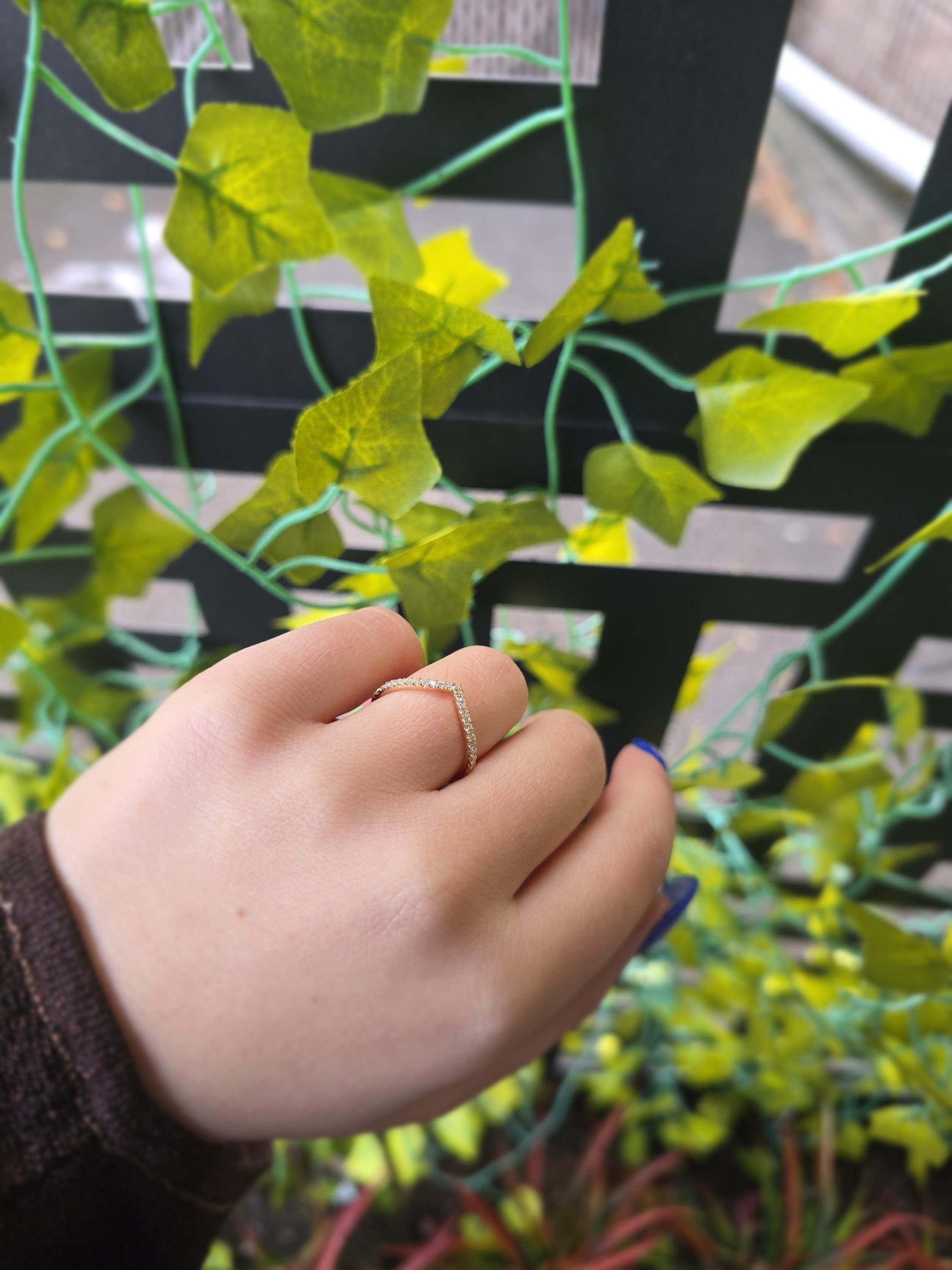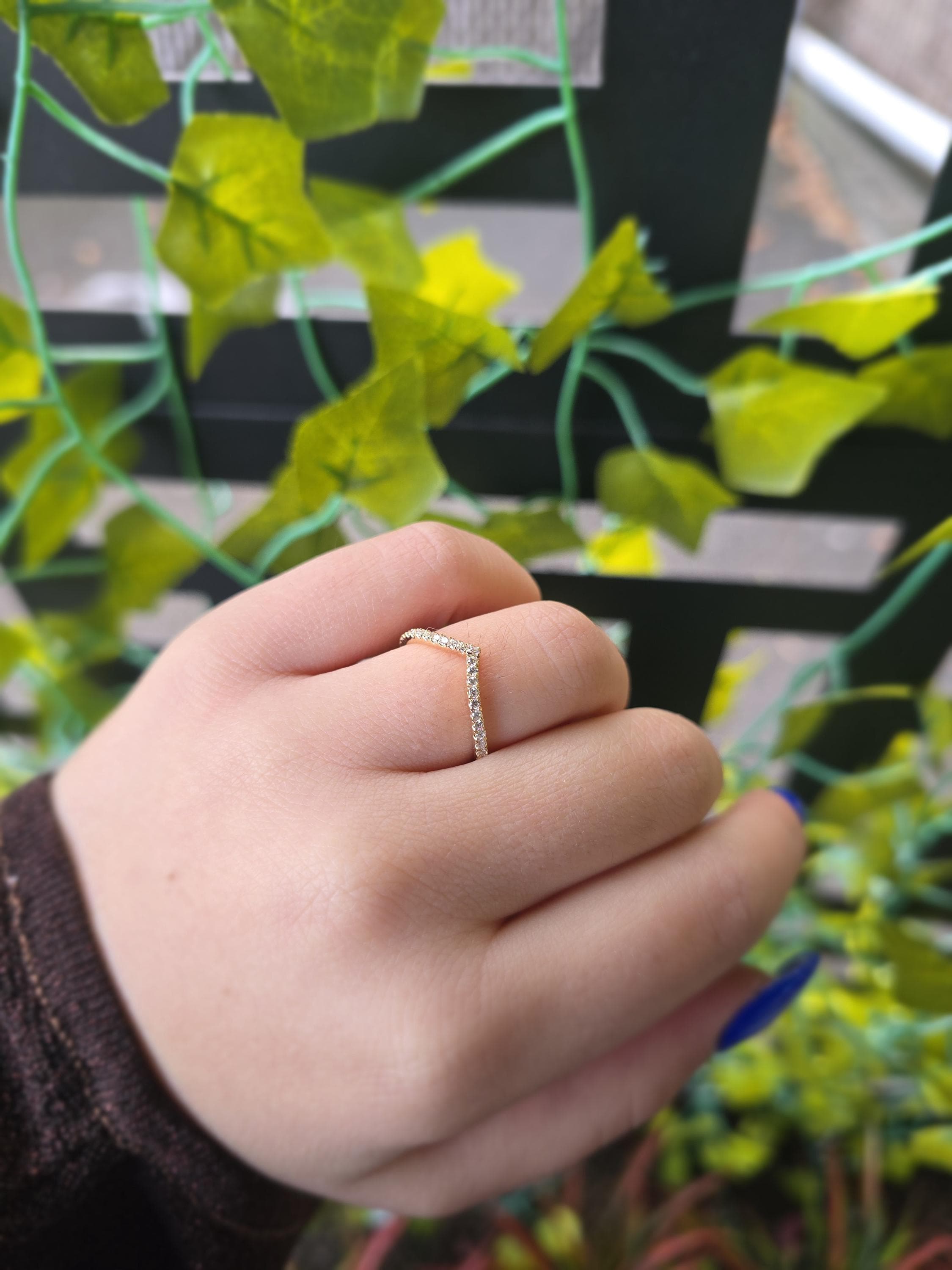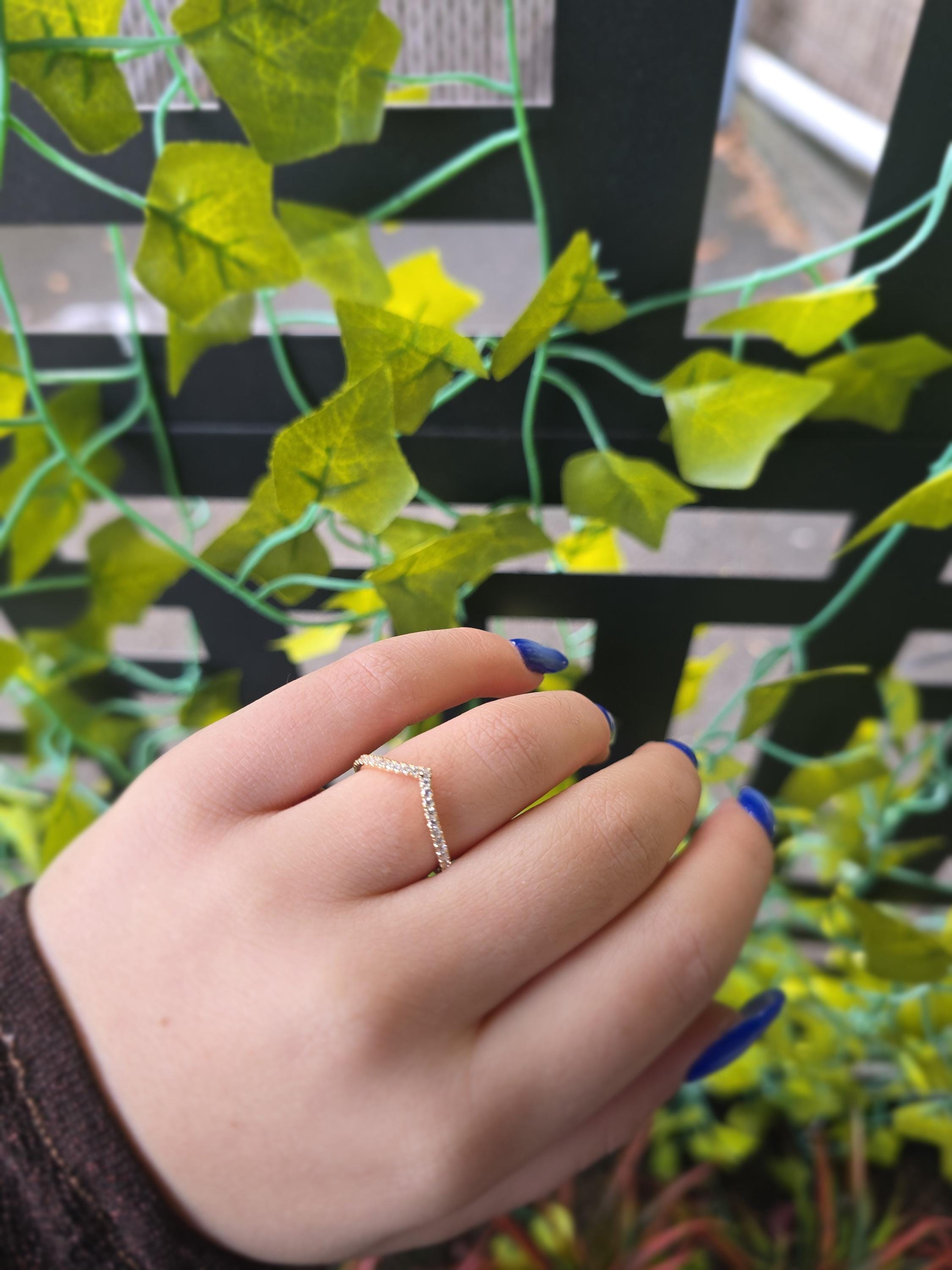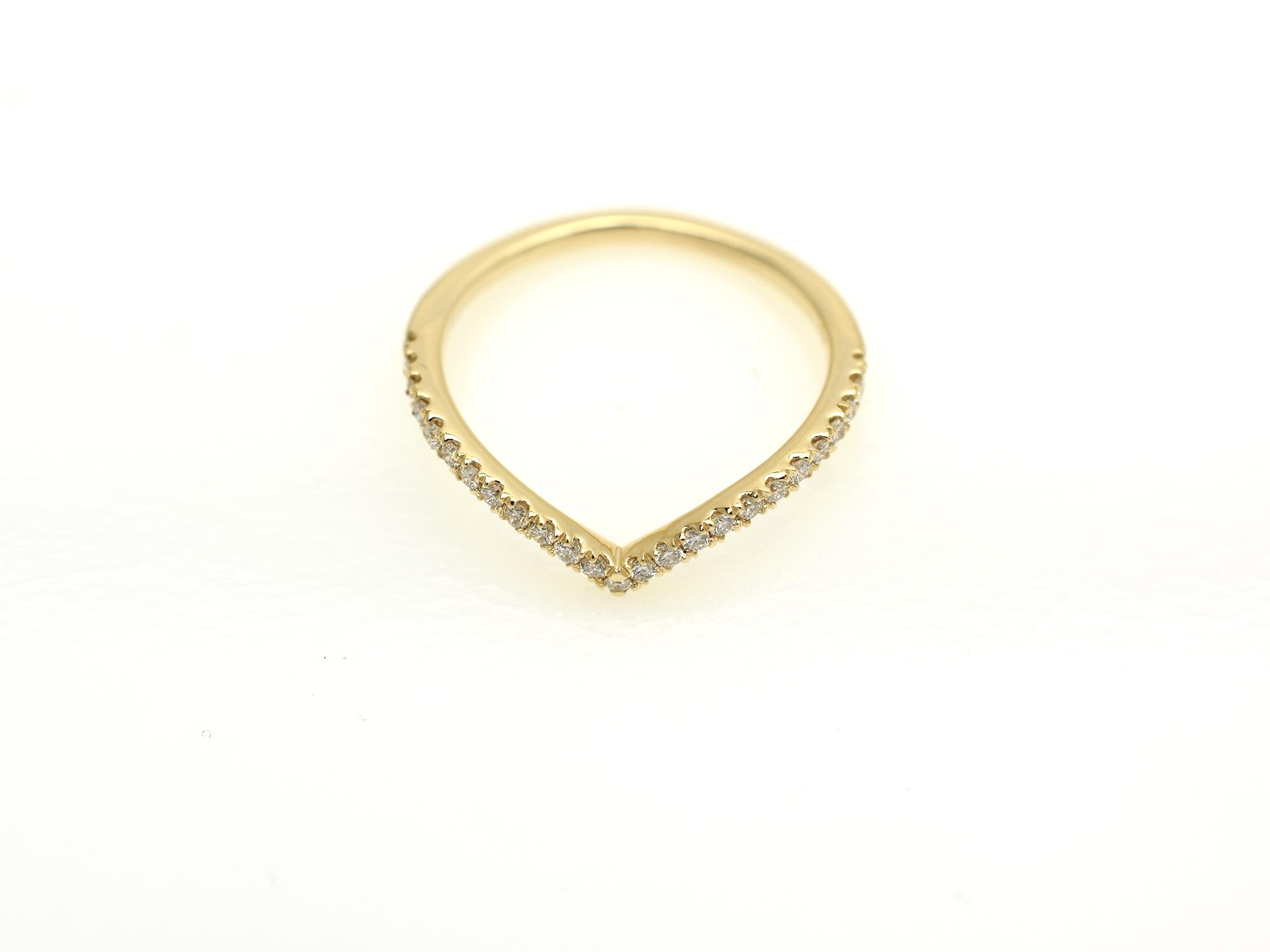 Elevate your jewelry stack with our handcrafted 14K Gold Diamond Chevron Ring. This elegant "V" shaped band features a shimmering row of 0.20 carats of genuine natural diamonds, meticulously set in solid 14K gold. Whether you’re looking for a unique wedding band to complement your engagement ring or a sophisticated thumb ring, this wishbone design offers a timeless, flattering silhouette.