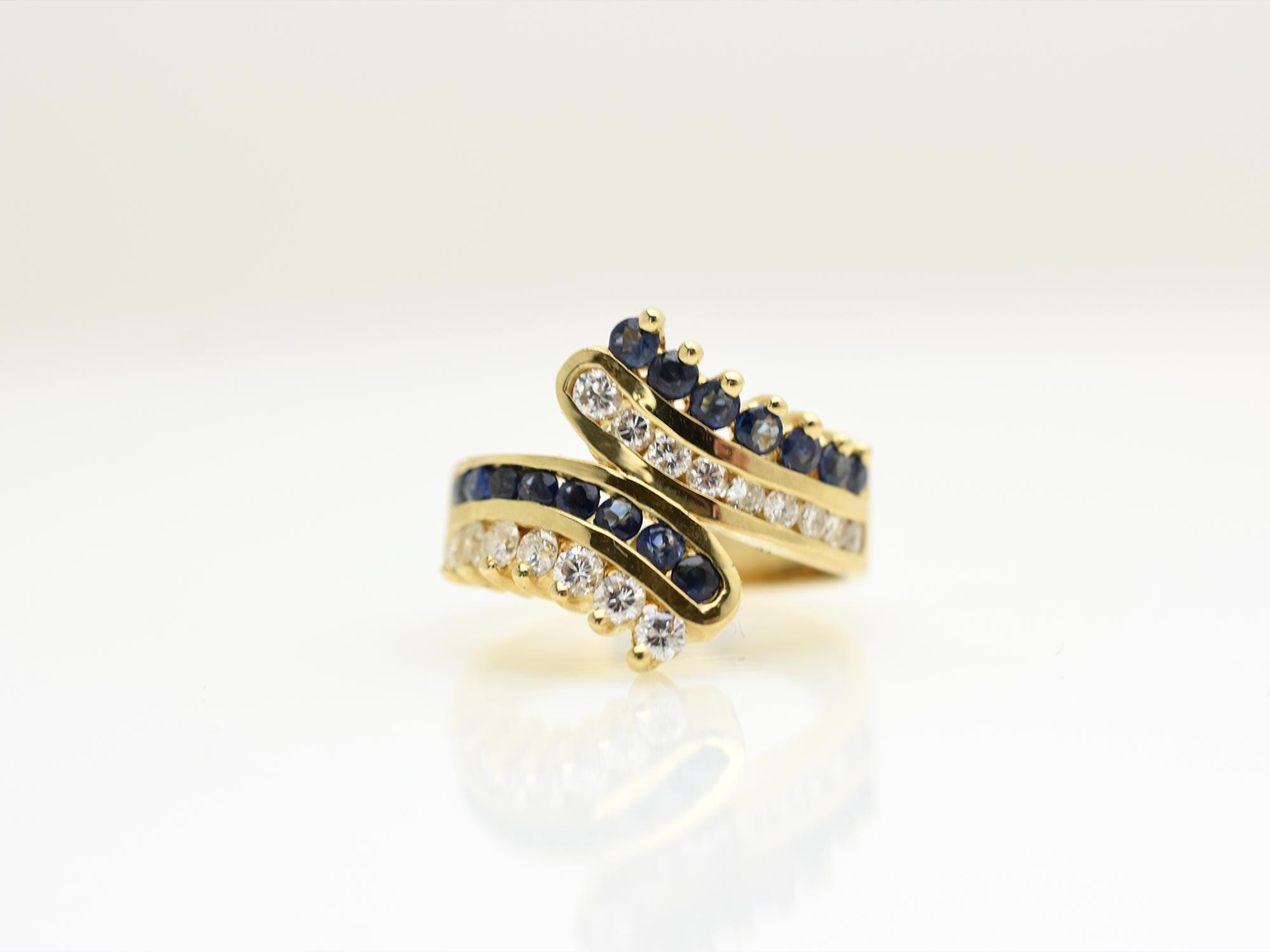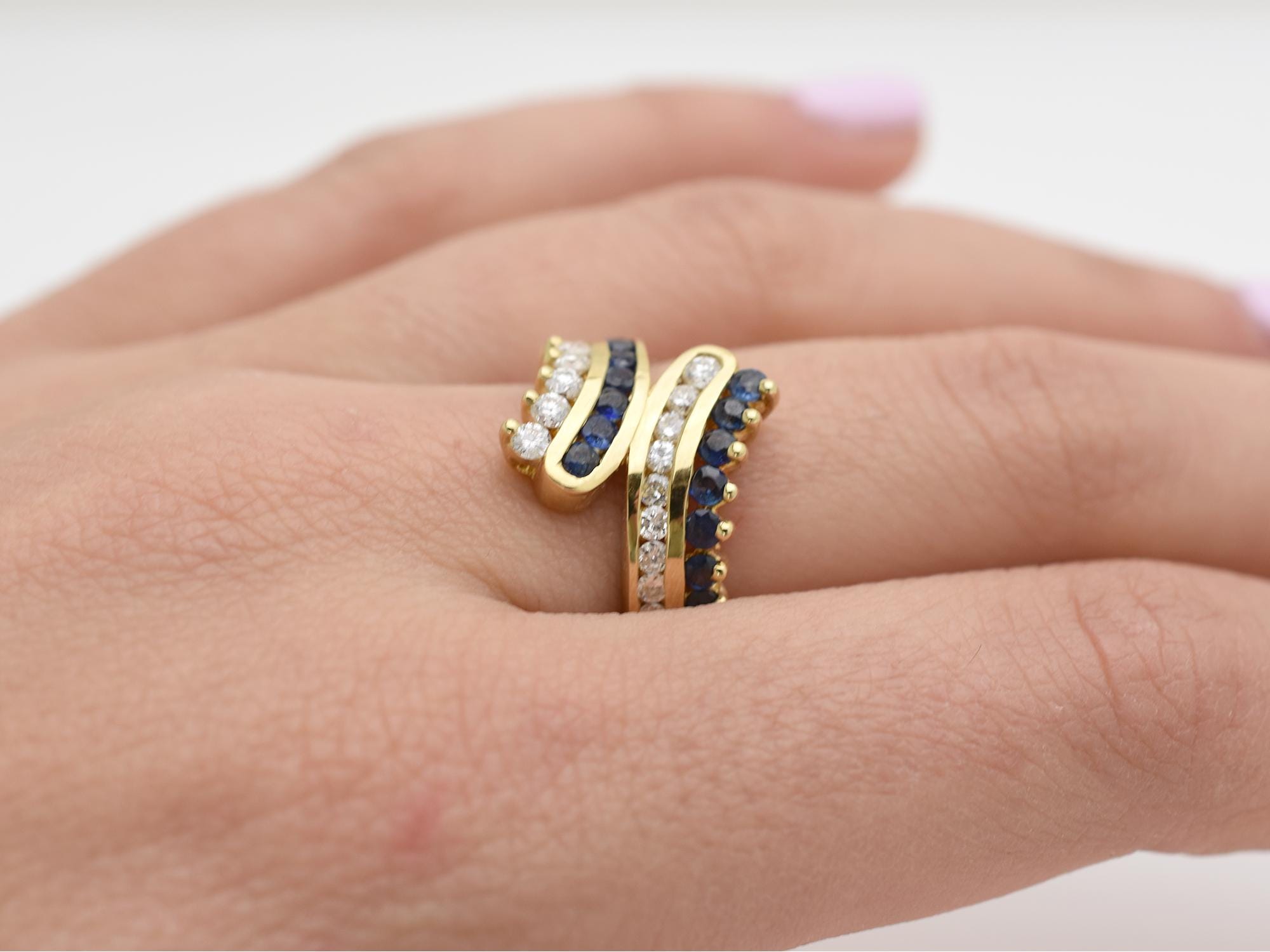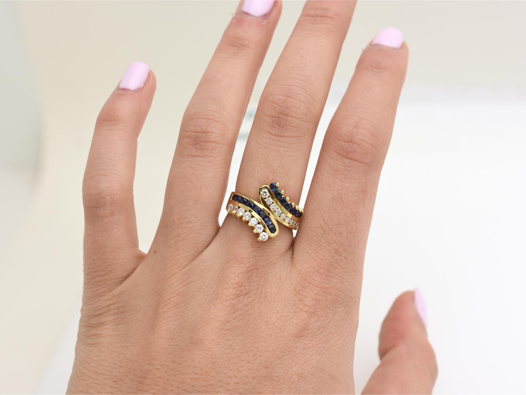 A stunning statement piece featuring rich natural blue sapphires and sparkling diamonds set in solid 14k yellow gold. The bold 16mm wide bypass-style band creates a striking, eye-catching look perfect for everyday luxury or a special occasion.