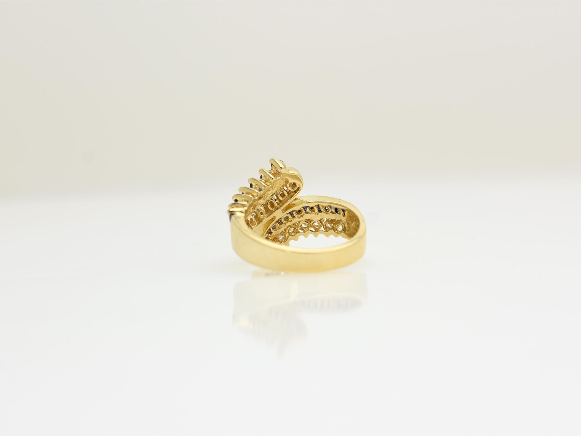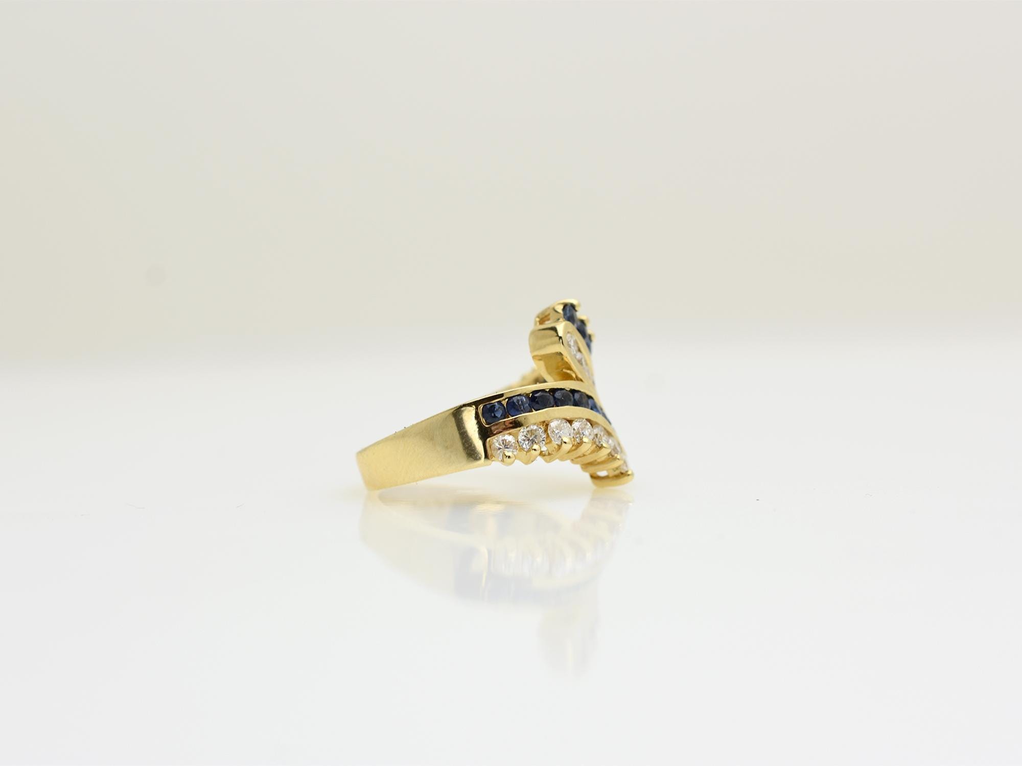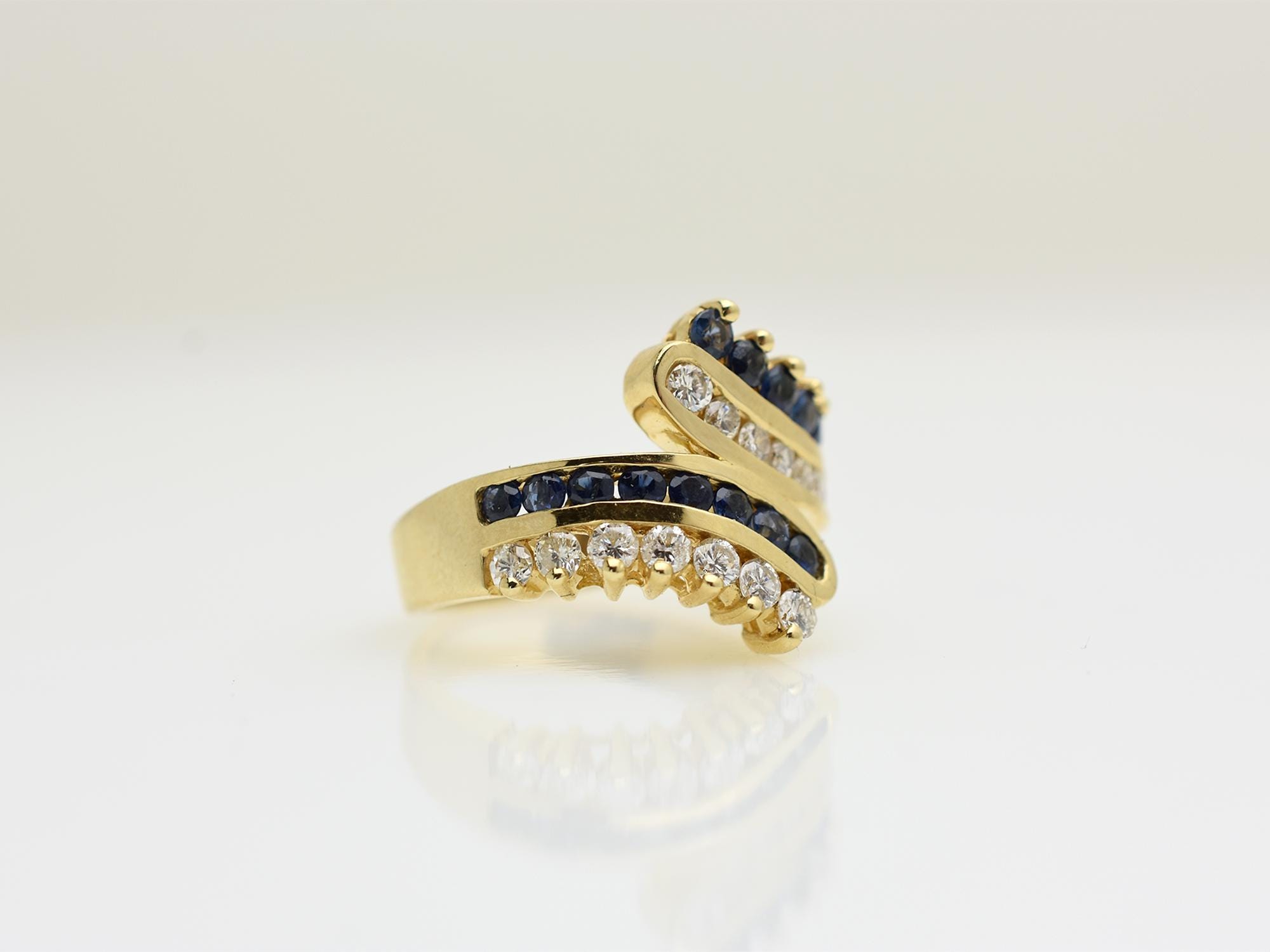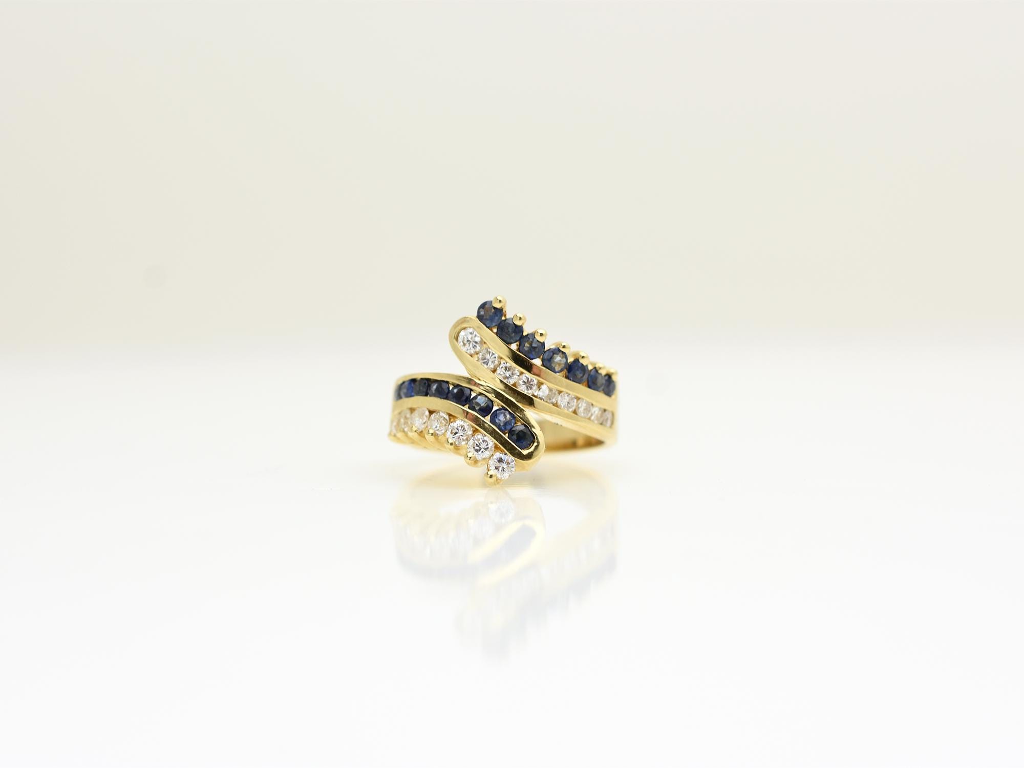 A stunning statement piece featuring rich natural blue sapphires and sparkling diamonds set in solid 14k yellow gold. The bold 16mm wide bypass-style band creates a striking, eye-catching look perfect for everyday luxury or a special occasion.