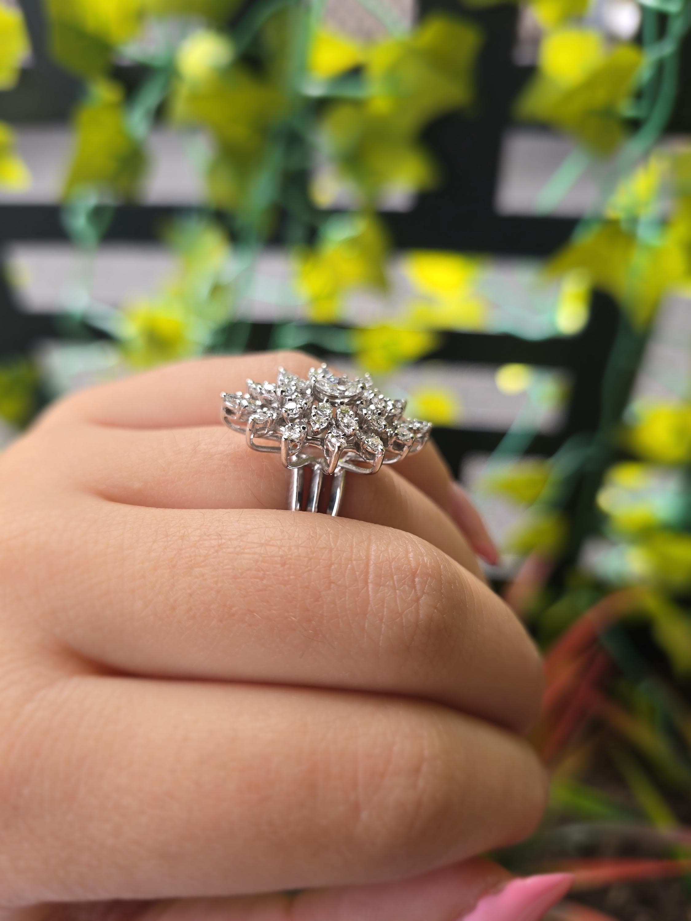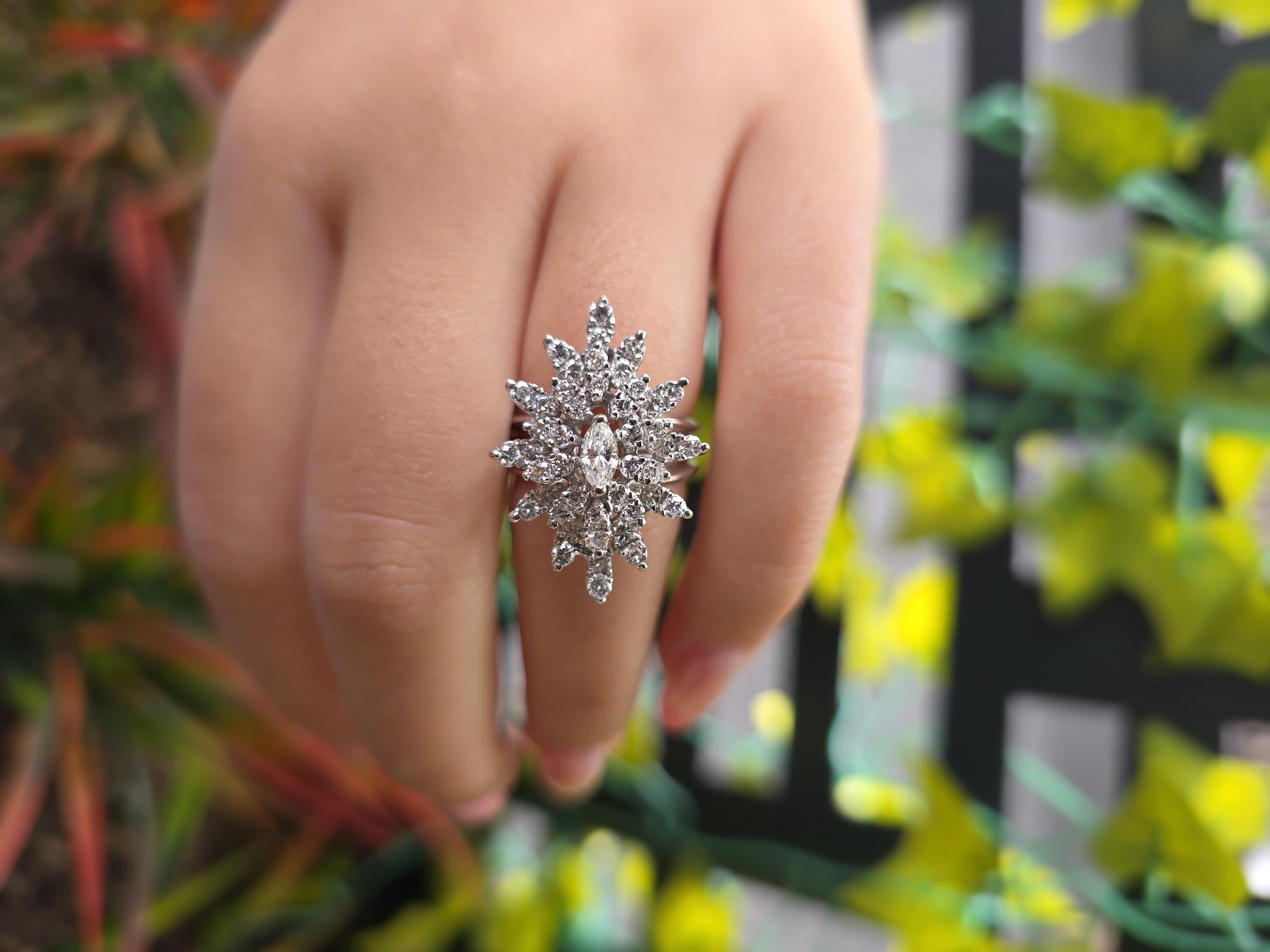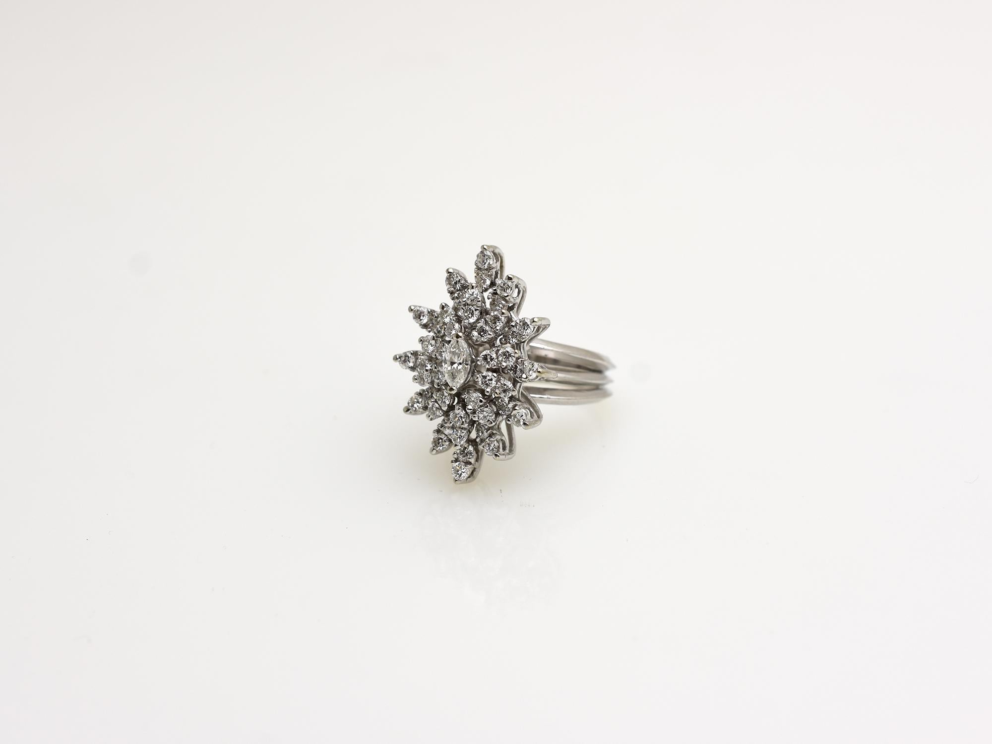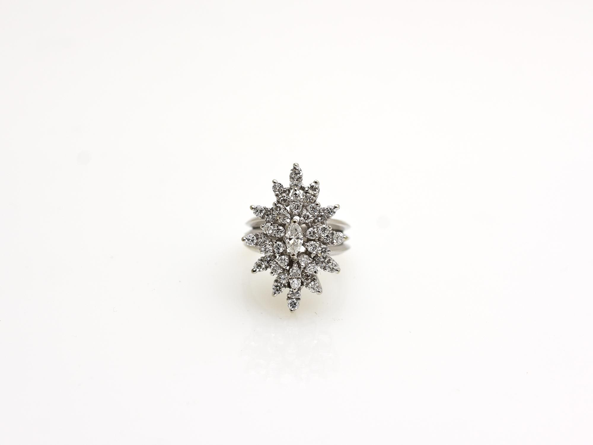 A breathtaking vintage starburst cluster of natural diamonds set in solid 18K white gold. The marquise center diamond is framed by a constellation of diamonds radiating outward in an intricate, hand-crafted setting that catches light from every angle. This is fine jewelry with serious presence.