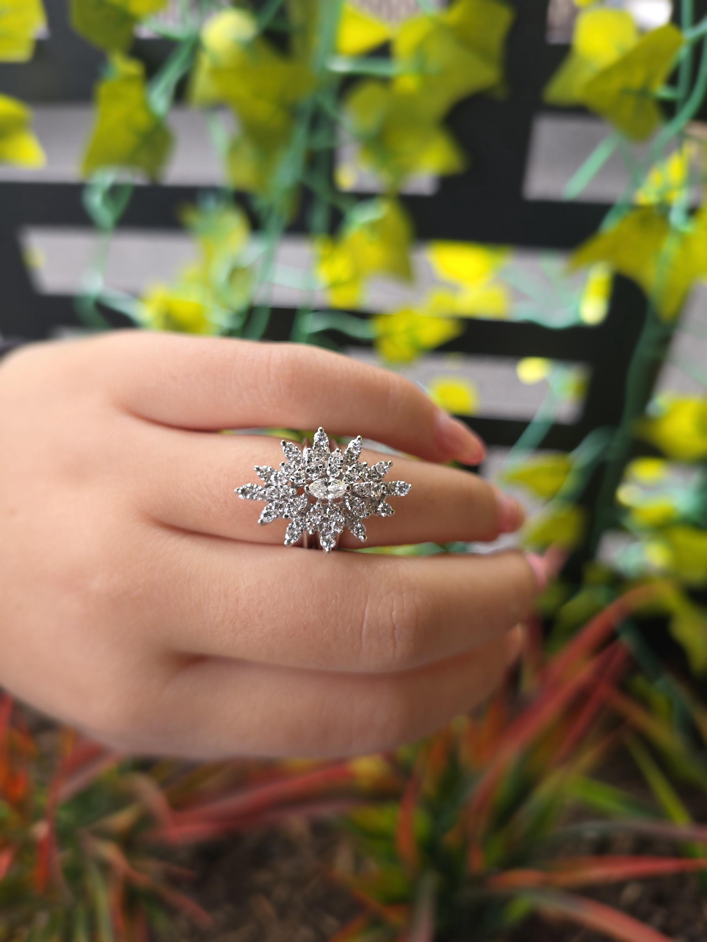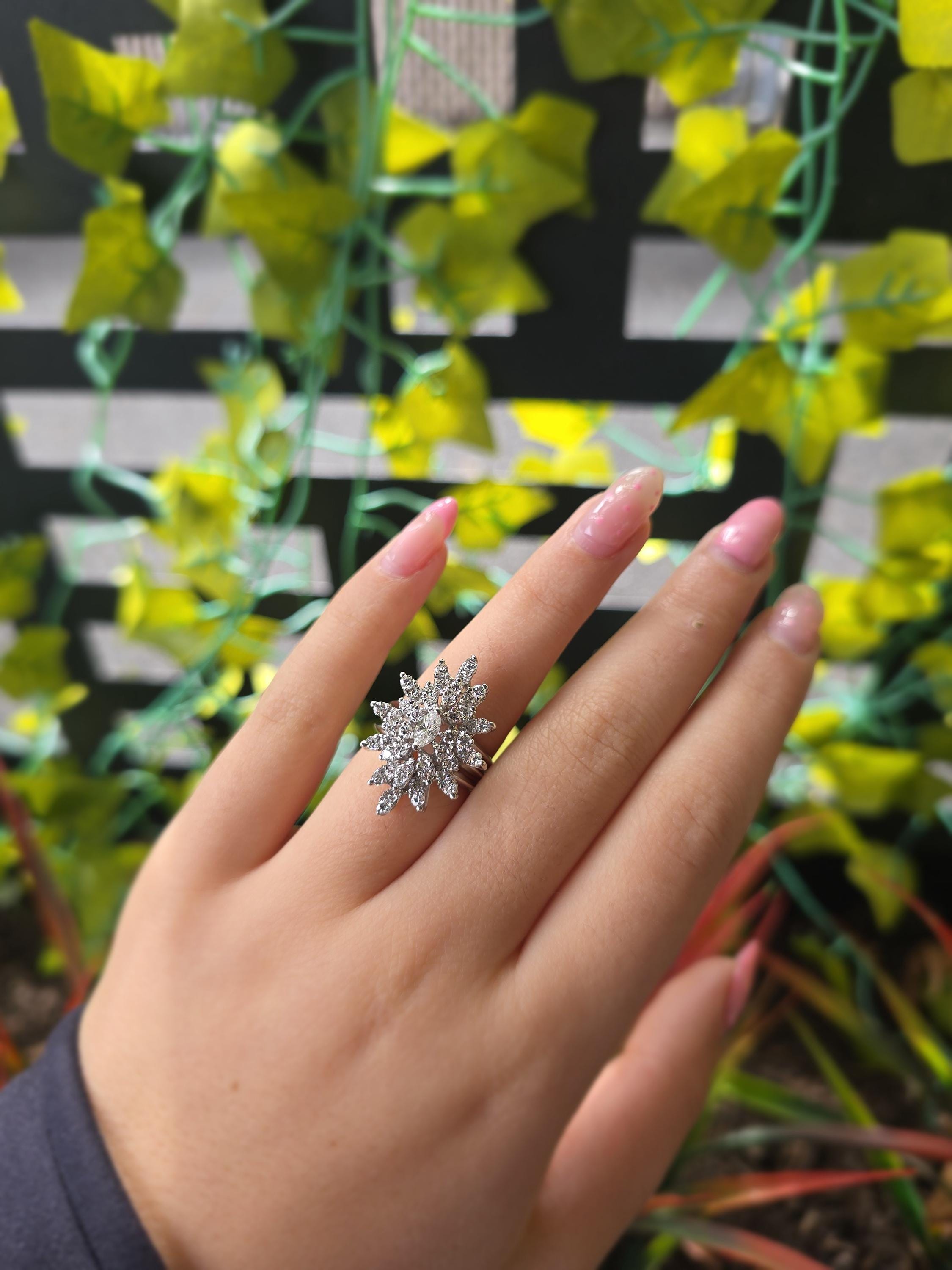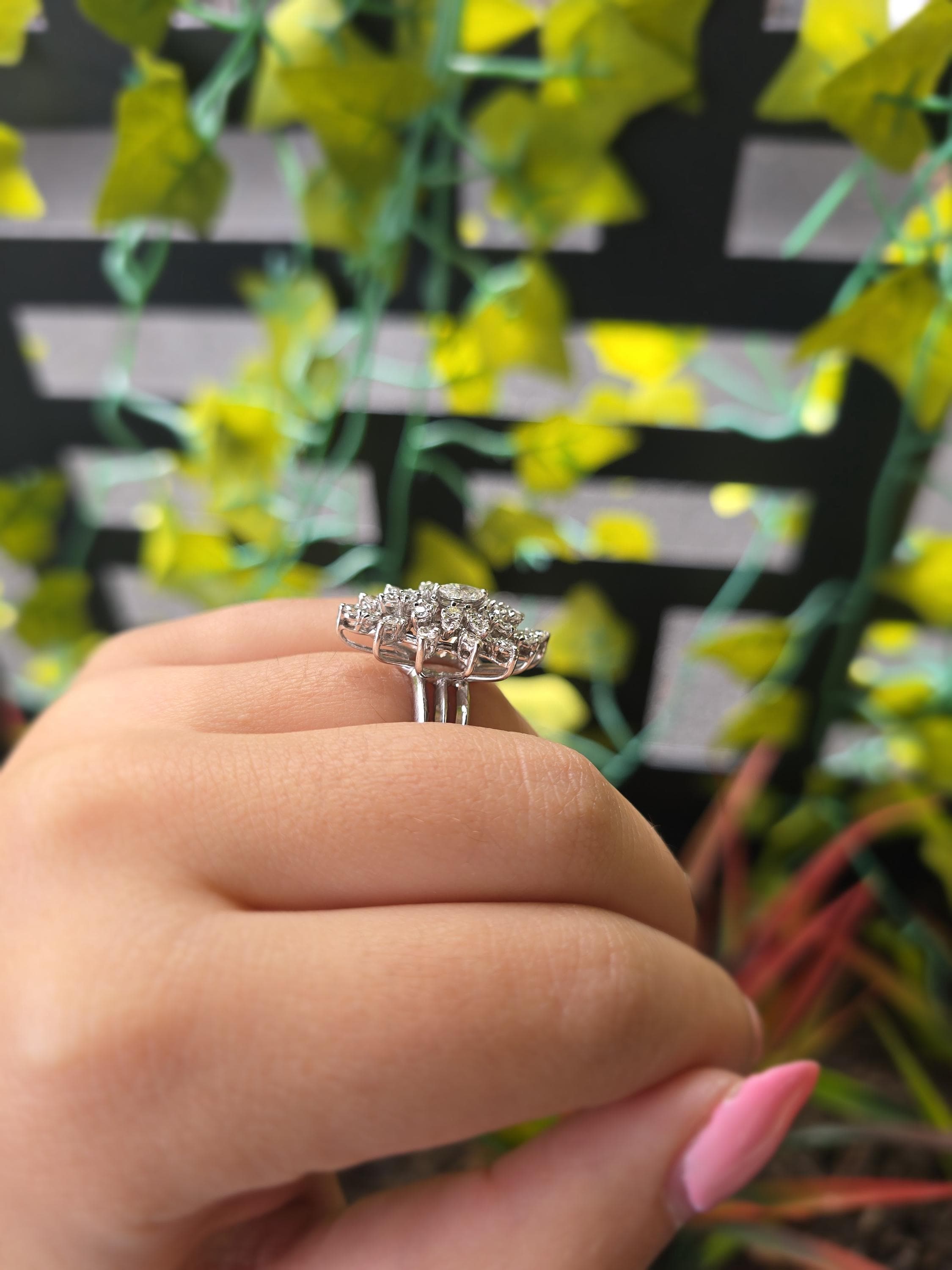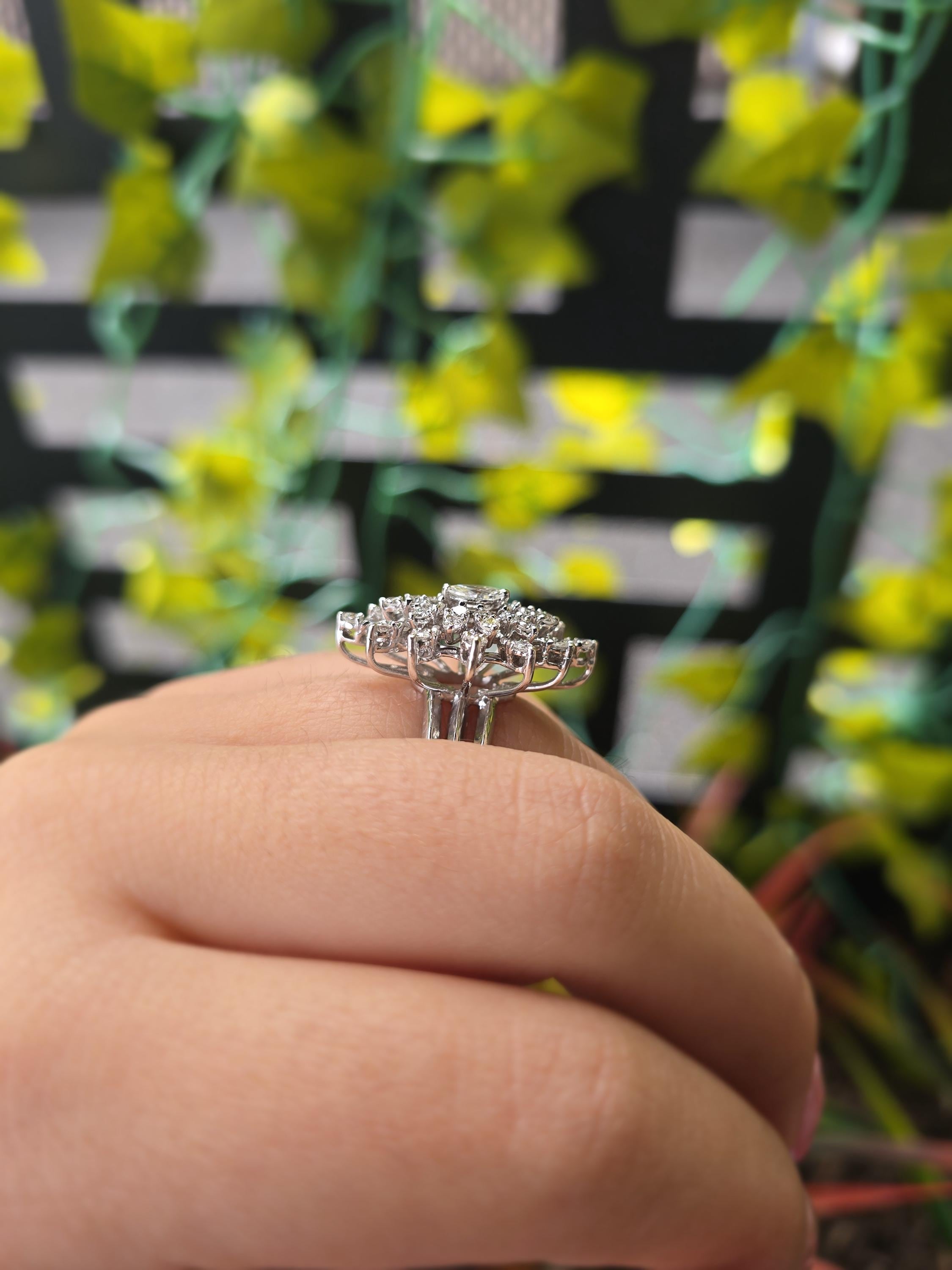 A breathtaking vintage starburst cluster of natural diamonds set in solid 18K white gold. The marquise center diamond is framed by a constellation of diamonds radiating outward in an intricate, hand-crafted setting that catches light from every angle. This is fine jewelry with serious presence.