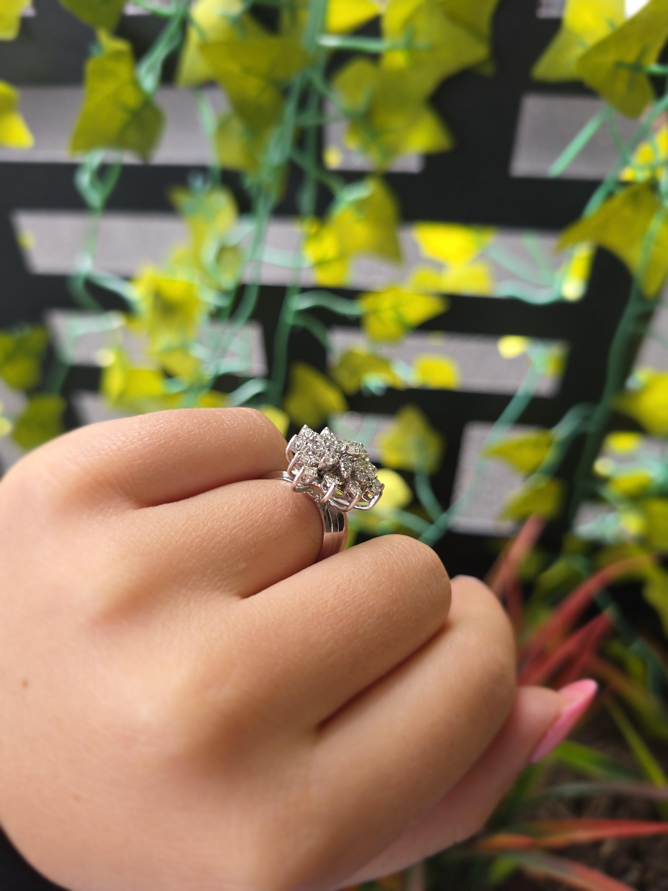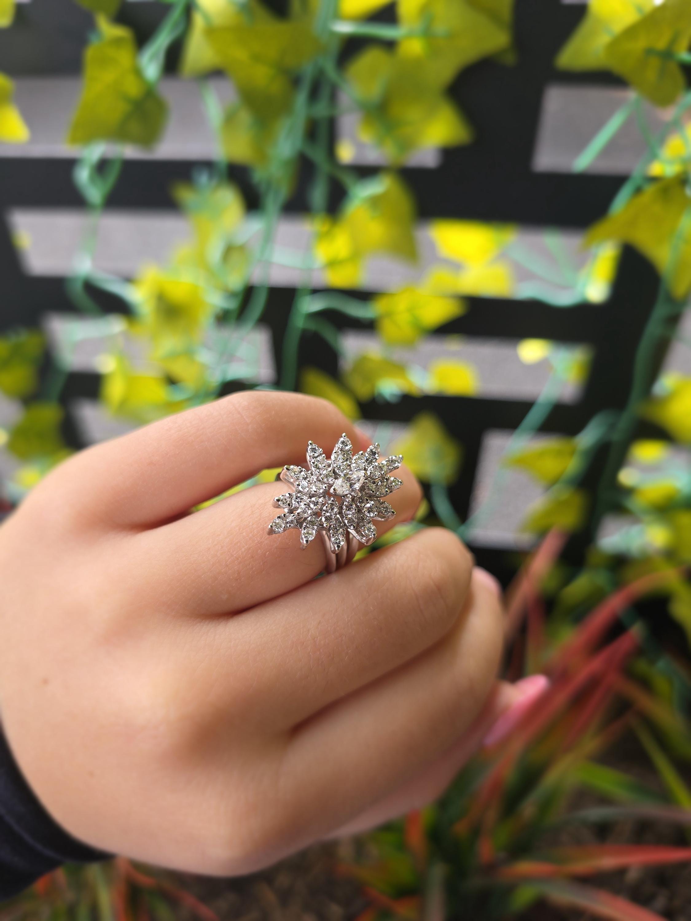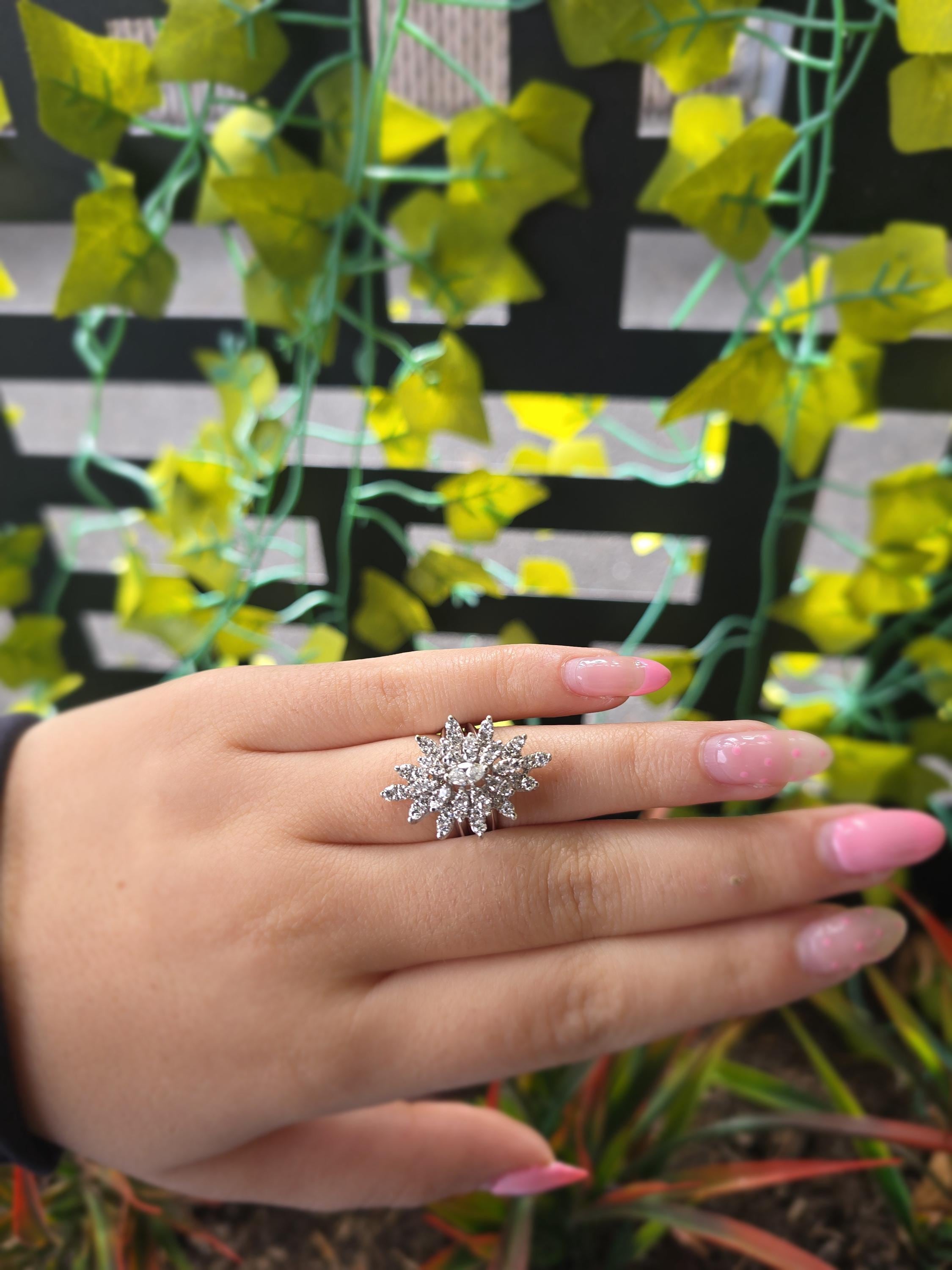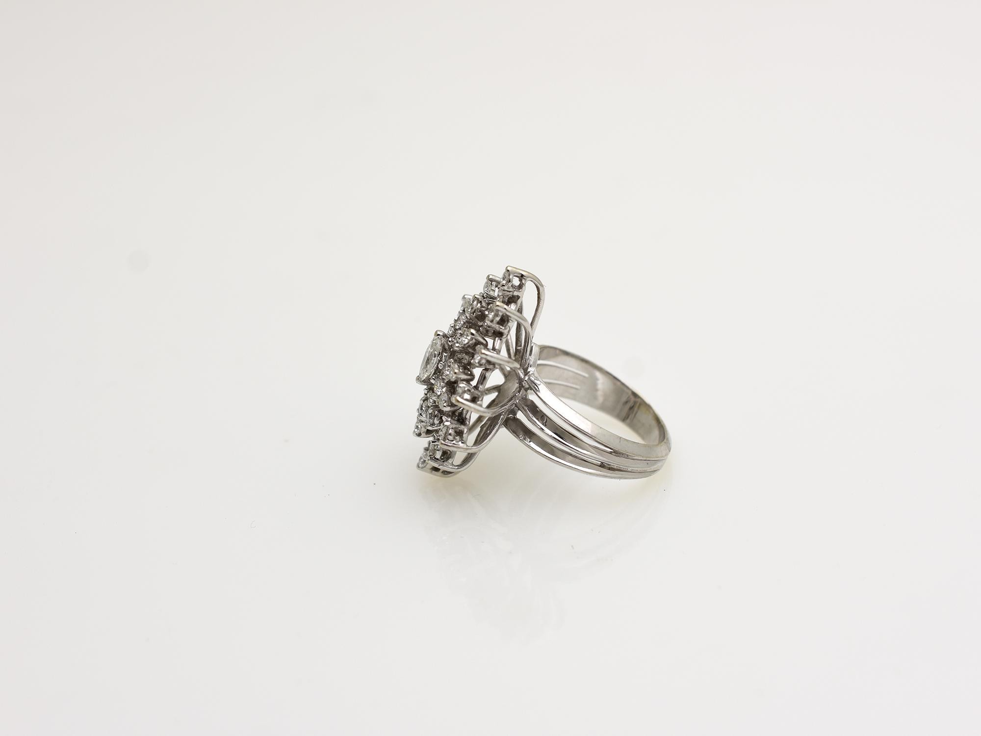 A breathtaking vintage starburst cluster of natural diamonds set in solid 18K white gold. The marquise center diamond is framed by a constellation of diamonds radiating outward in an intricate, hand-crafted setting that catches light from every angle. This is fine jewelry with serious presence.