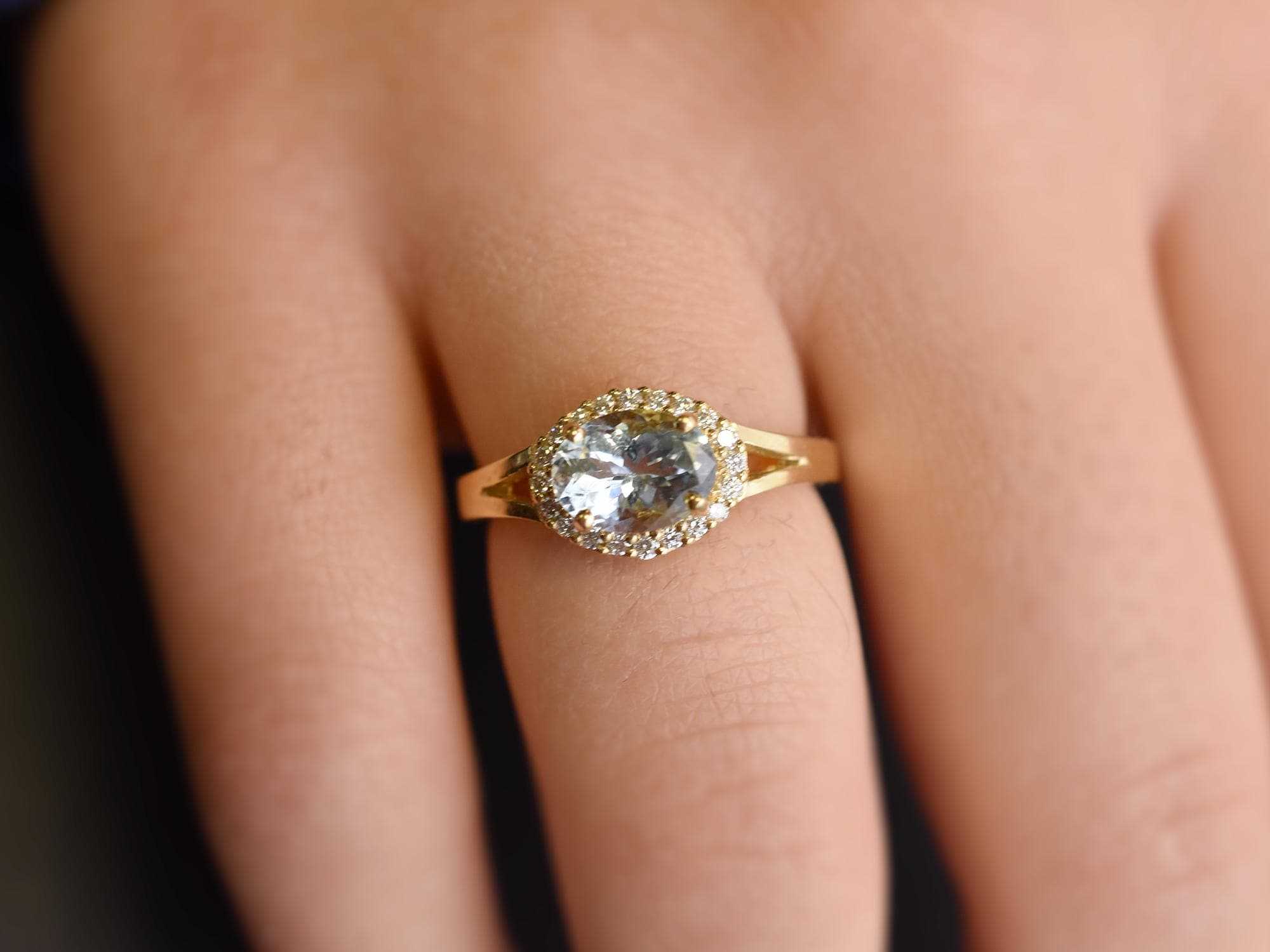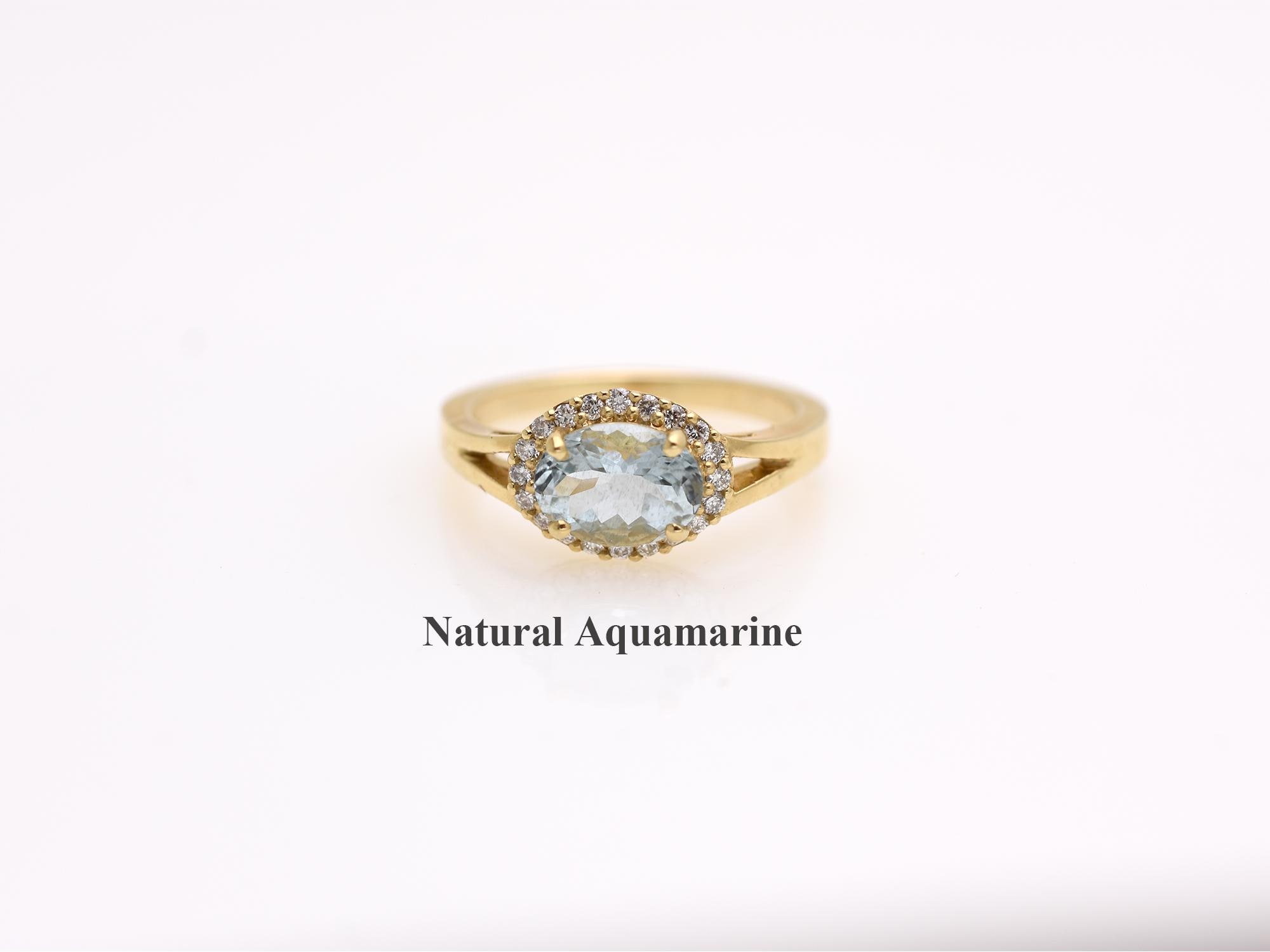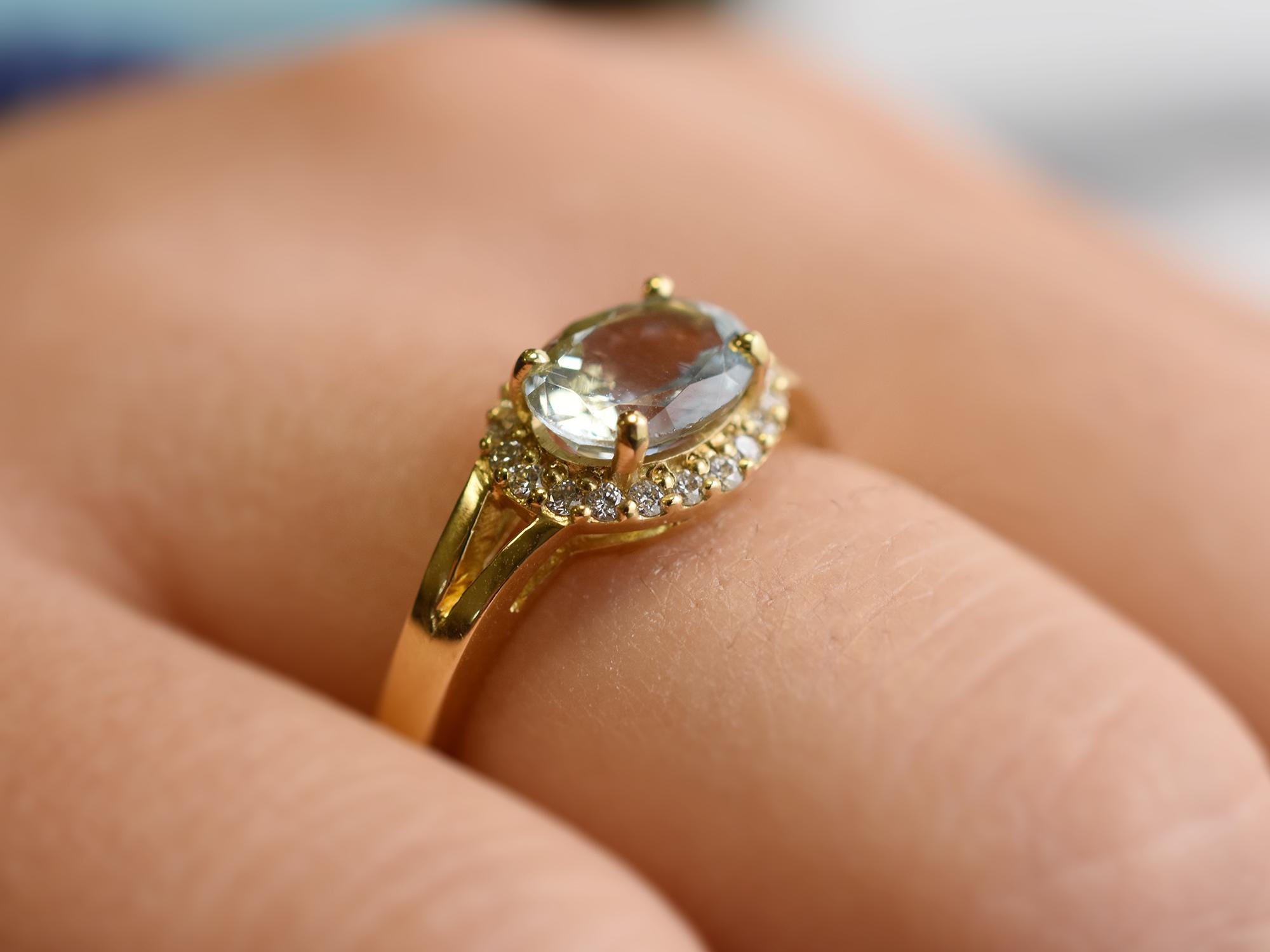 A luminous oval aquamarine nestled in a brilliant diamond halo, set in solid 14K gold. The soft blue-green of the aquamarine glows against the warm richness of yellow gold (or cool elegance of white or rose) while the surrounding natural diamond halo adds a brilliant frame of light. Feminine, refined, and completely wearable as an everyday fine jewelry piece or a special occasion ring.