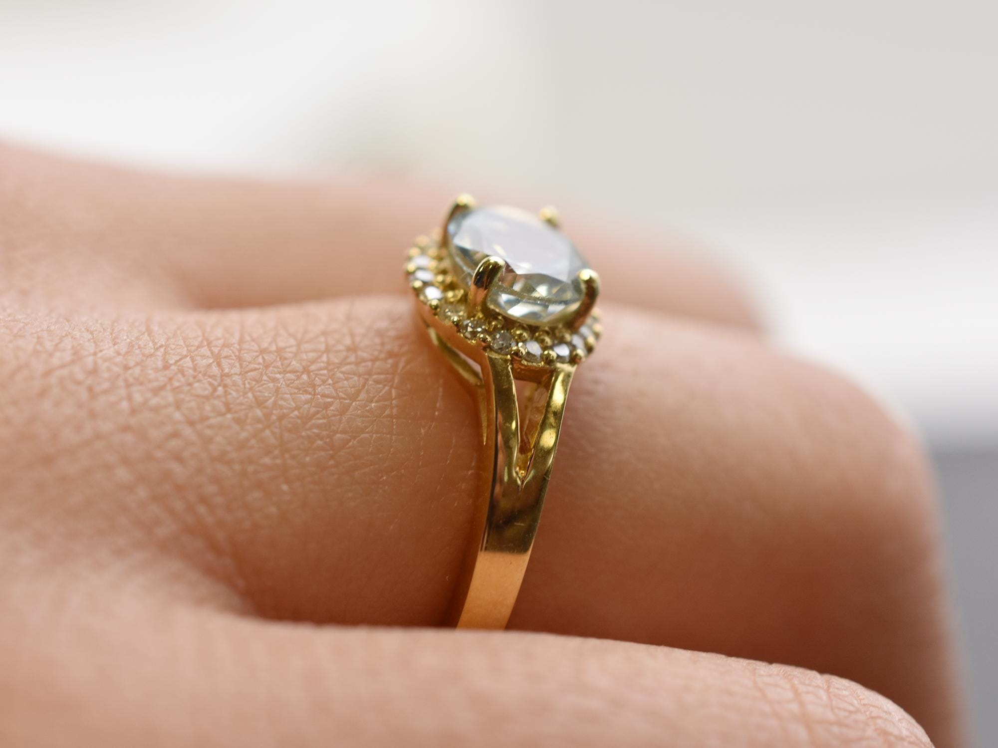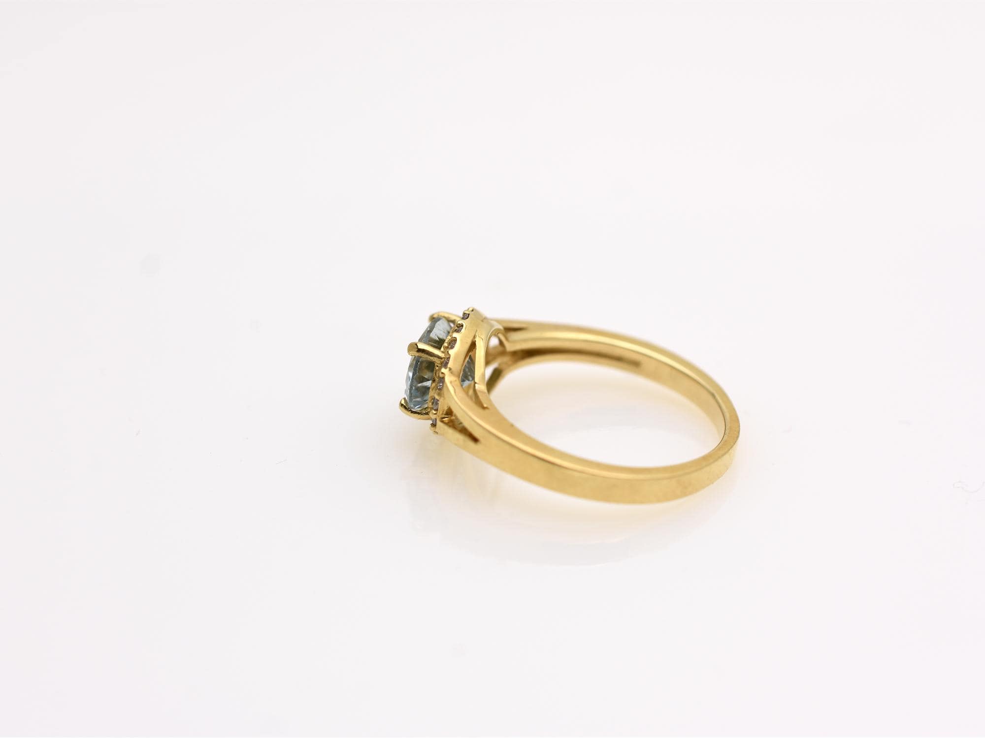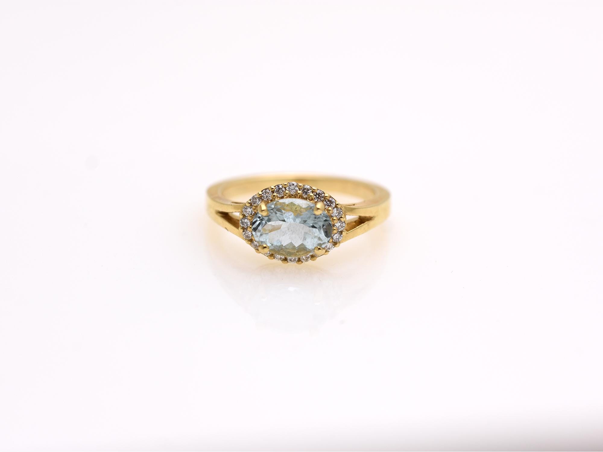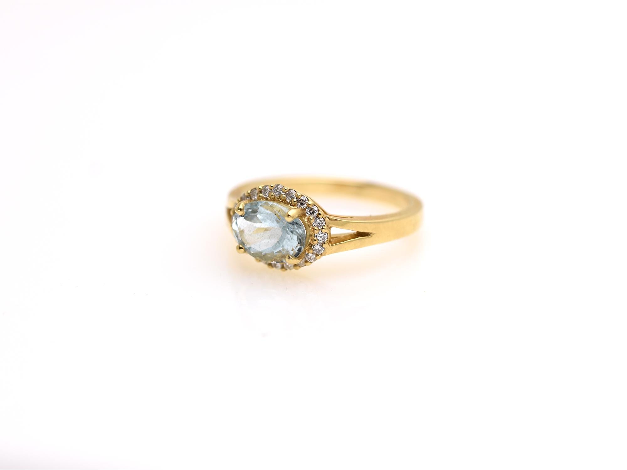 A luminous oval aquamarine nestled in a brilliant diamond halo, set in solid 14K gold. The soft blue-green of the aquamarine glows against the warm richness of yellow gold (or cool elegance of white or rose) while the surrounding natural diamond halo adds a brilliant frame of light. Feminine, refined, and completely wearable as an everyday fine jewelry piece or a special occasion ring.