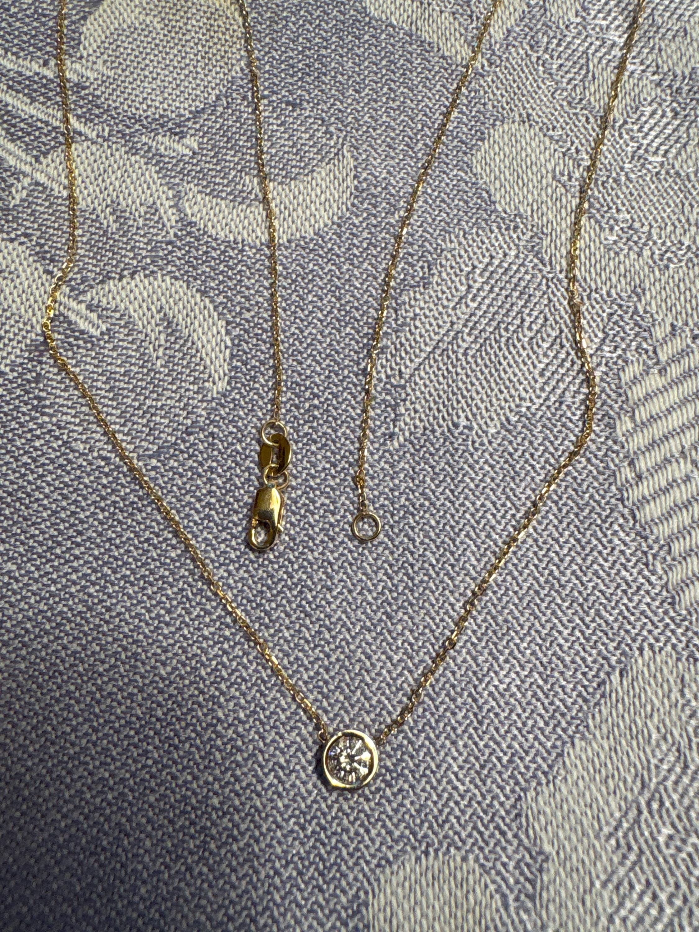 STUNNING HAND MADE NATURAL DIAMOND BEZEL NECKLACE MOST ELEGANT WAY OF SETTING ANY DIAMOND. DELICATE BUT STRONG CHAIN CAN BE ANY LENGTH YOU WANT. THIS NECKLACE IS AVAILABLE IN VARIOUS DIAMOND SIZES. I MAKE THESE IN ALL LENGTHS AND DIFFERENT COLOR 14K GOLD . PLEASE SPECIFY THE DIAMOND SIZE, LENGTH AND COLOR WHEN ORDERING.