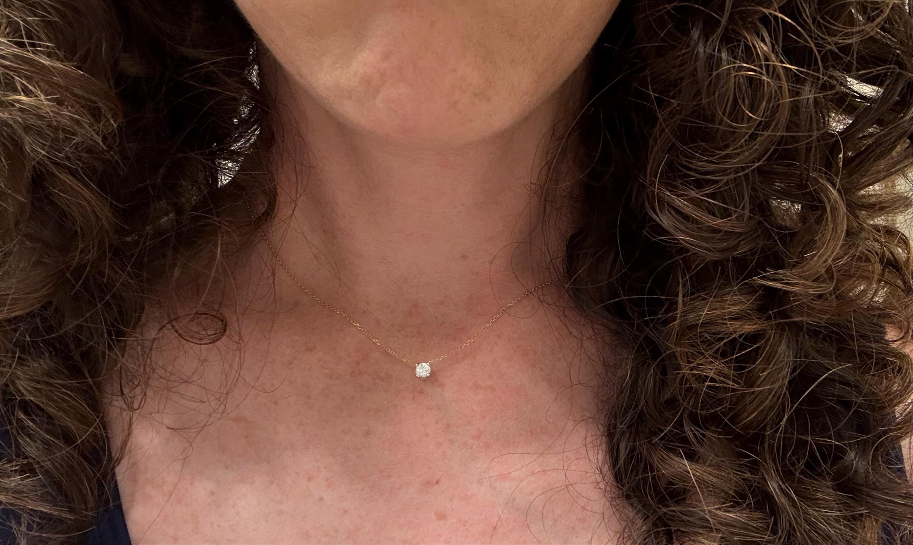 This diamond necklace is stunning! Seller responded quickly and helped me with a custom length. The necklace arrived quicker than expected and is truly beautiful and dainty. Love it and haven’t taken it off! Mine is .25 CT and 15 inch length for reference.