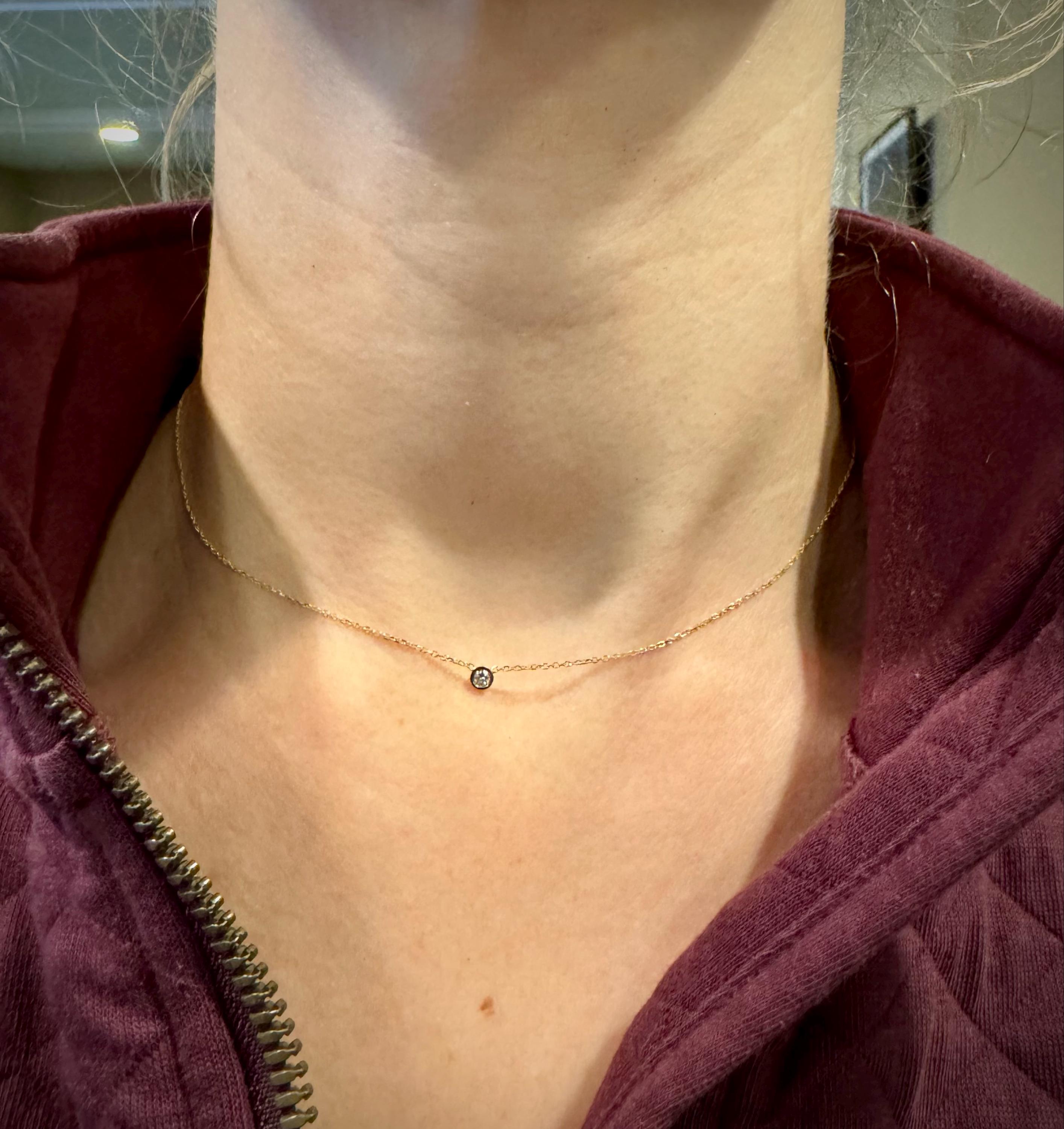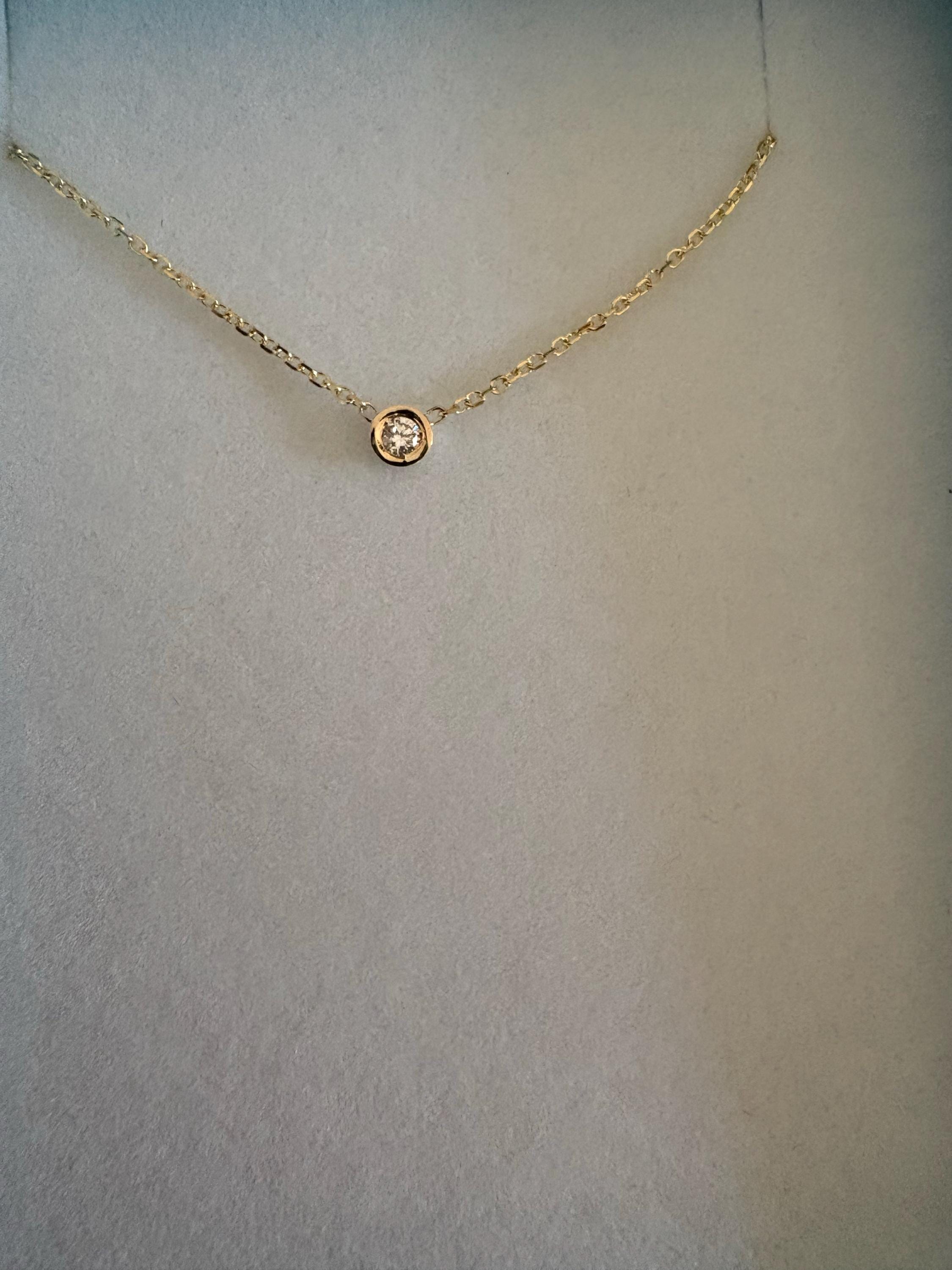 STUNNING HAND MADE DIAMOND BEZEL NECKLACE 0.03ct MOST ELEGANT WAY OF SETTING ANY DIAMOND. DELICATE BUT STRONG DIAMOND CUT CABLE LINK CHAIN CAN BE ANY LENGTH YOU WANT WITH A STURDY LOBSTER LOCK .THE DIAMOND IS A BRILLIANT CUT NATURAL EARTH MINED DIAMOND SI1 CLARITY G COLOR. I MAKE THIS NECKLACE IN VARIOUS DIAMOND SIZES. I MAKE THIS NECKLACE IN 14K GOLD, 14K ROSE GOLD AND 14K WHITE GOLD AND IN MANY LENGTHS. PLEASE SPECIFY THE DIAMOND SIZE AND THE COLOR GOLD AND LENGTH OF THE NECKLACE.