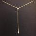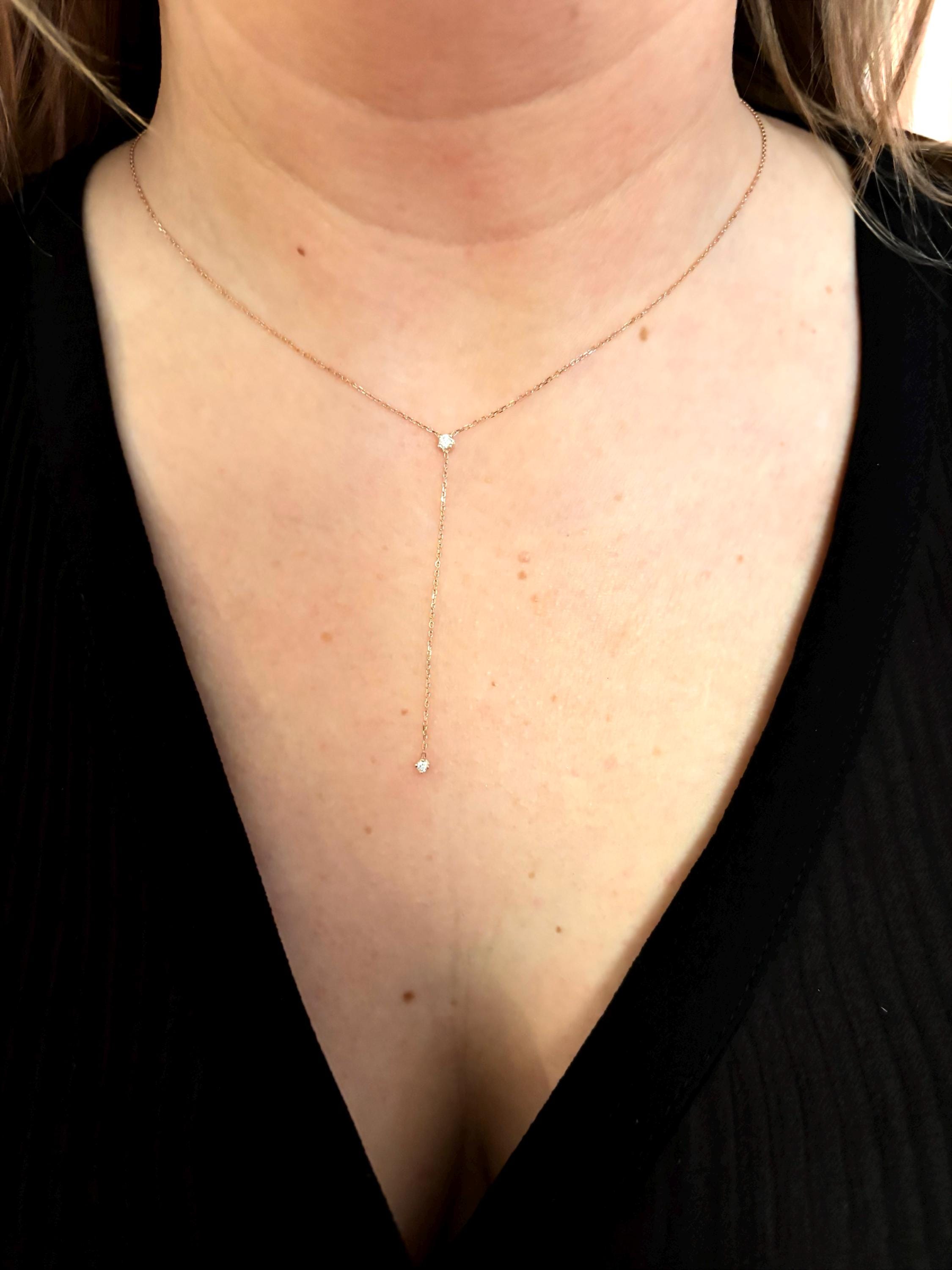 HANDMADE AND HANDSET DIAMOND LARIAT NECKLACE. STUNNING IN ITS SIMPLICITY AND ELEGANCE. THERE IS A TOTAL CARAT WEIGHT OF 0.08CT . FEATURED PICTURE IS A DIAMOND PRONG SET NECKLACE 0.05CT ( 2.5 MM). THE DROP DOWN CHAIN IS 1.5 INCHES AND HAS A 0.03CT ( 2.0 MM) DIAMOND HANGING OFF OF IT. THE CHAIN IS A SOLID 14K YELLOW GOLD CABLE LINK CHAIN WITH A STURDY LOBSTER LOCK. I MAKE THIS IN 14K YELLOW GOLD, WHITE GOLD AND ROSE GOLD AS WELL AND EVERY LENGTH.